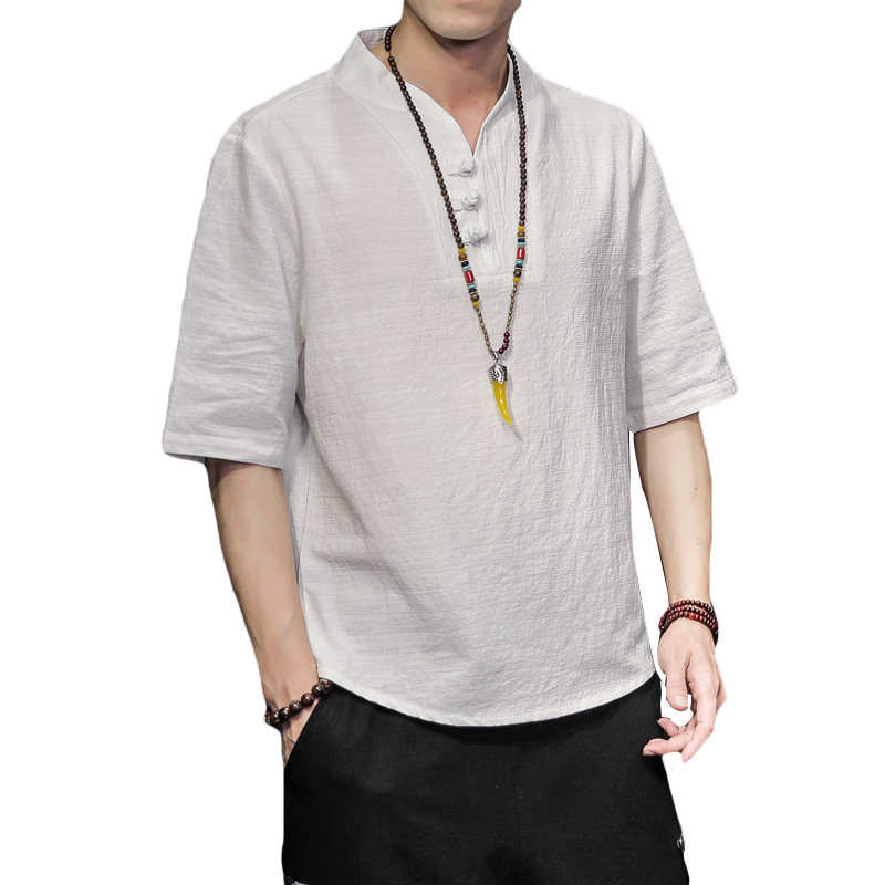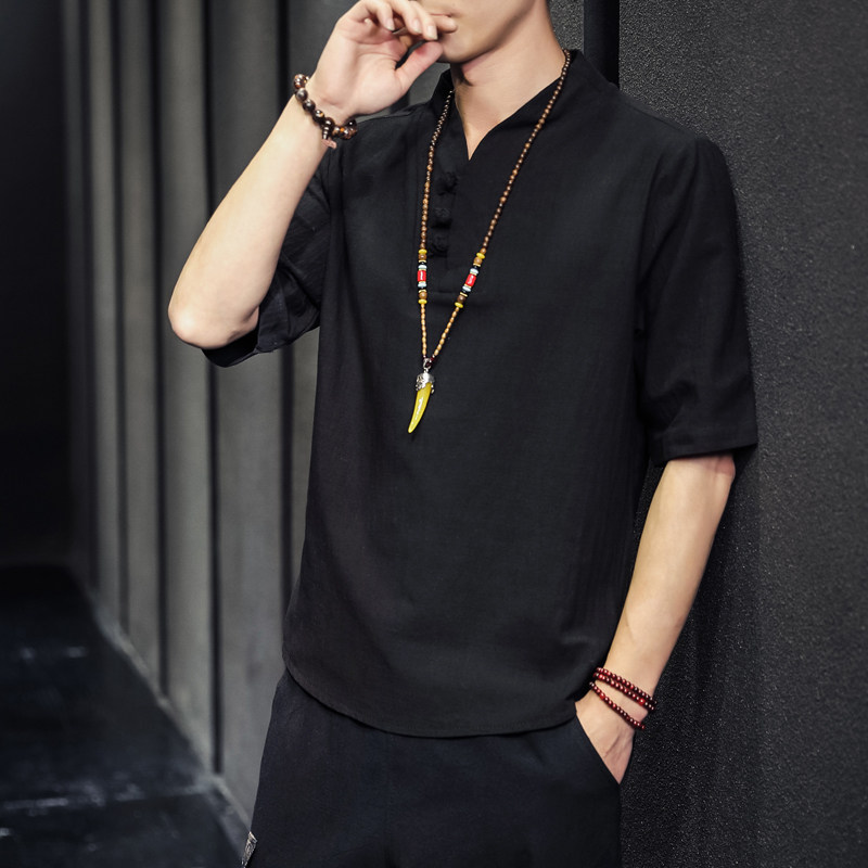 Chinese style linen short sleeve T-shirt men's summer cotton hemp half sleeve trend large size retro buckle loose V collar shirt men
