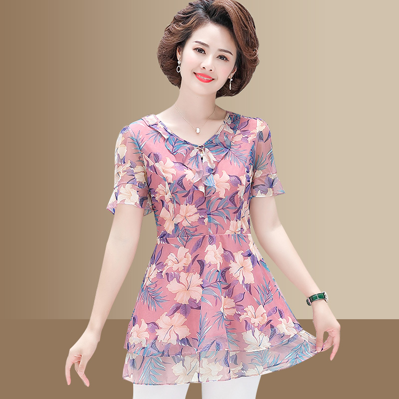Mom summer dress two-piece 40-50 years old middle-aged short-sleeved T-shirt women's chiffon top middle-aged women's Western style suit