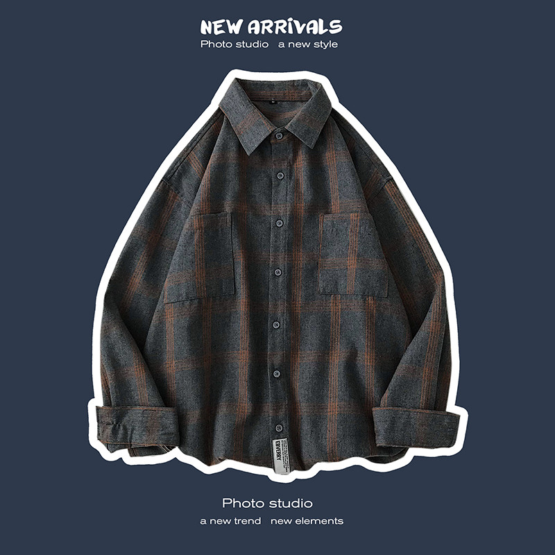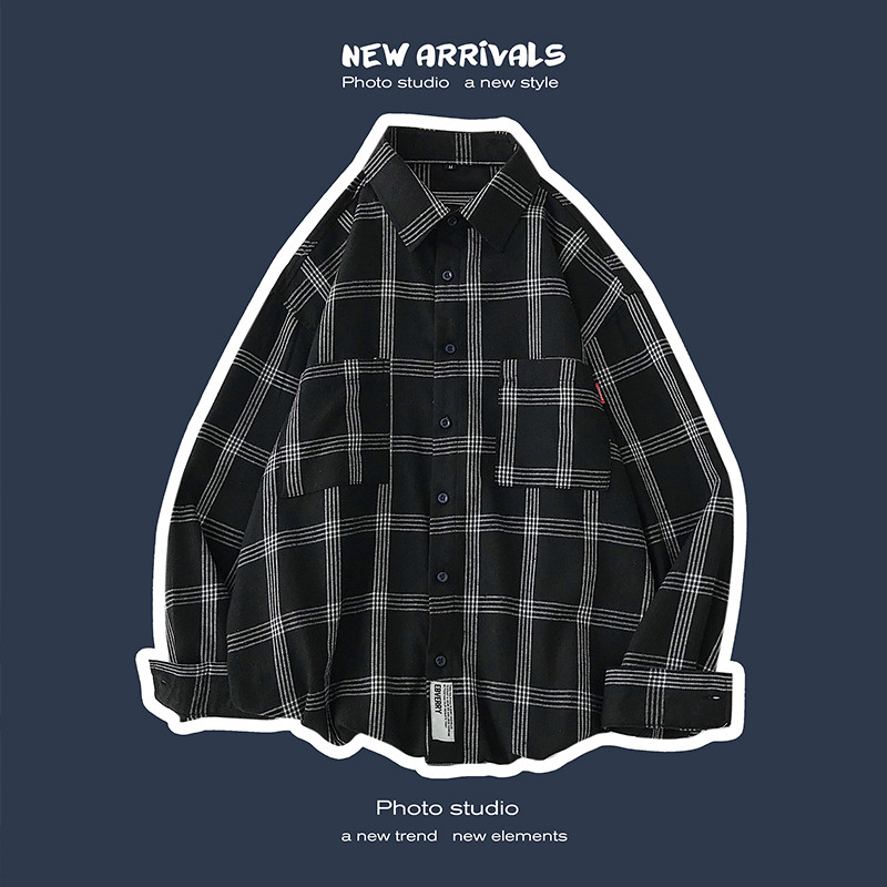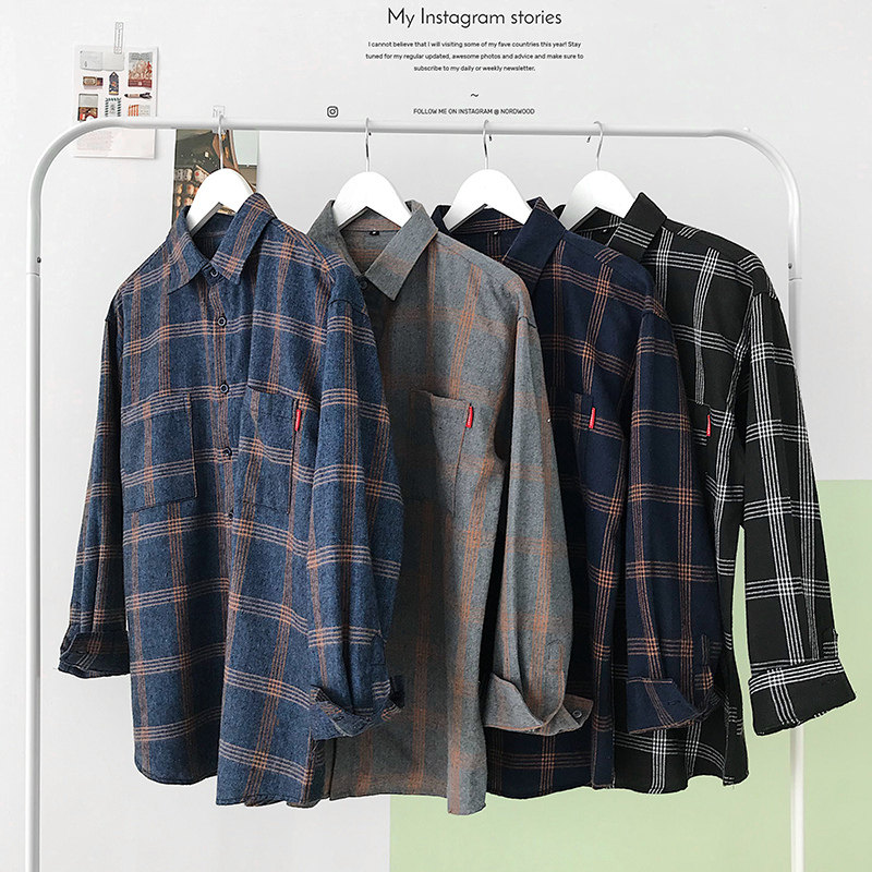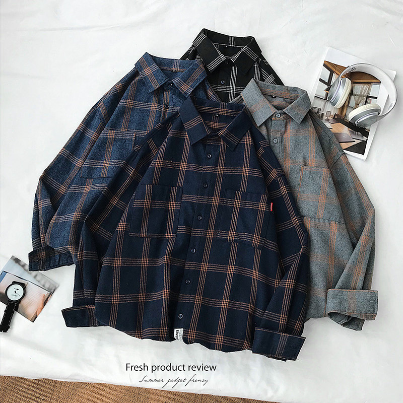 Men's long-sleeved shirt casual spring loose plaid trend shirt Korean version trend handsome couple bottom top