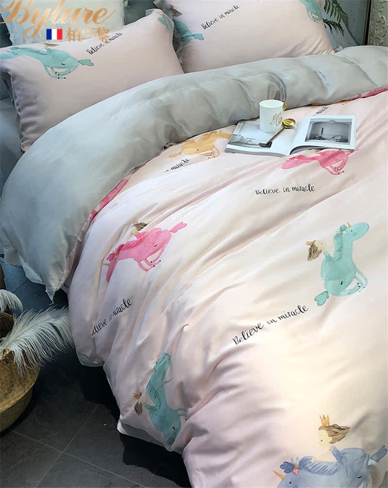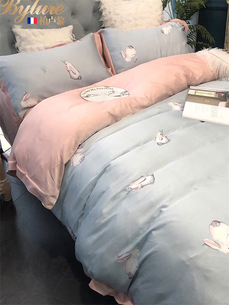 bylure high-end tiansilk four pieces of nude sleep summer silk slip cold sensation simple cartoon bed linen bed bedding