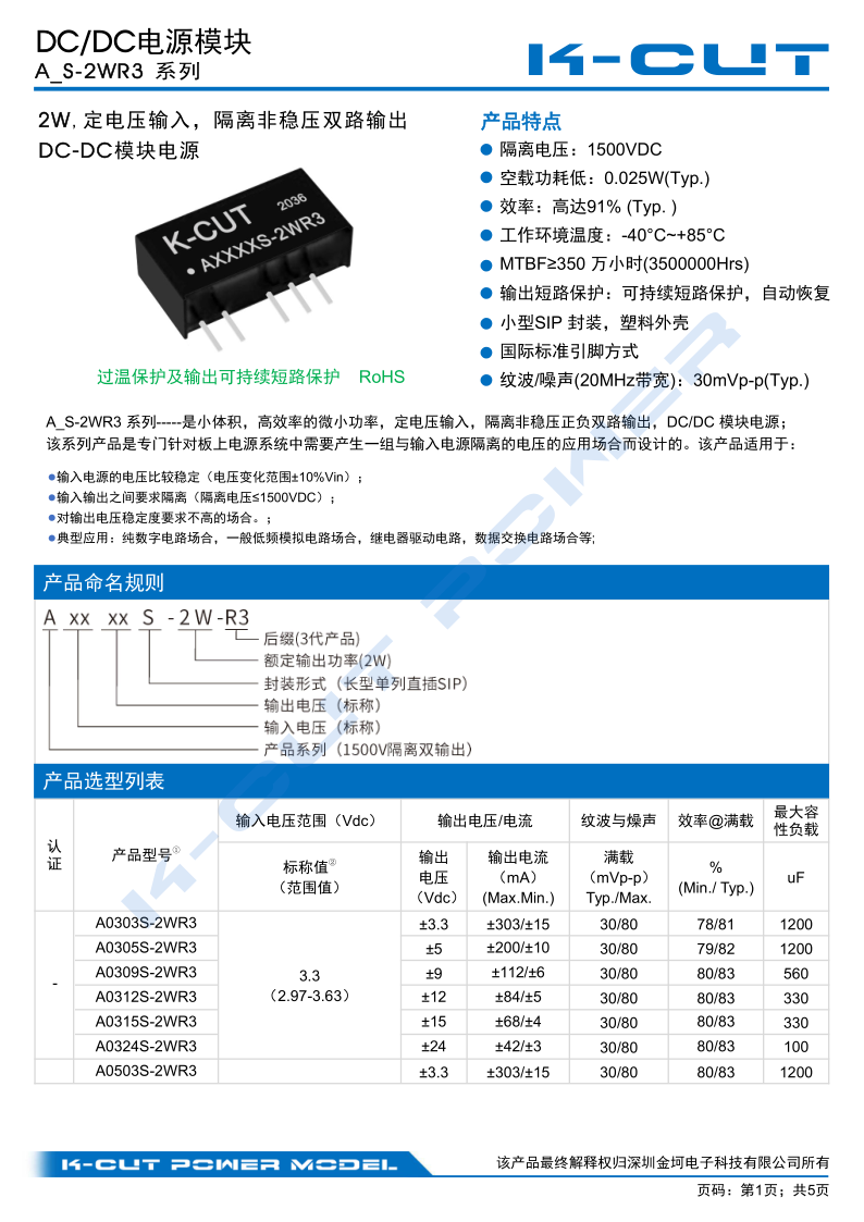 A0515S-2W K-CUT A0515S-2WR3 Constant voltage 5V to ±15V output DC-DC power module