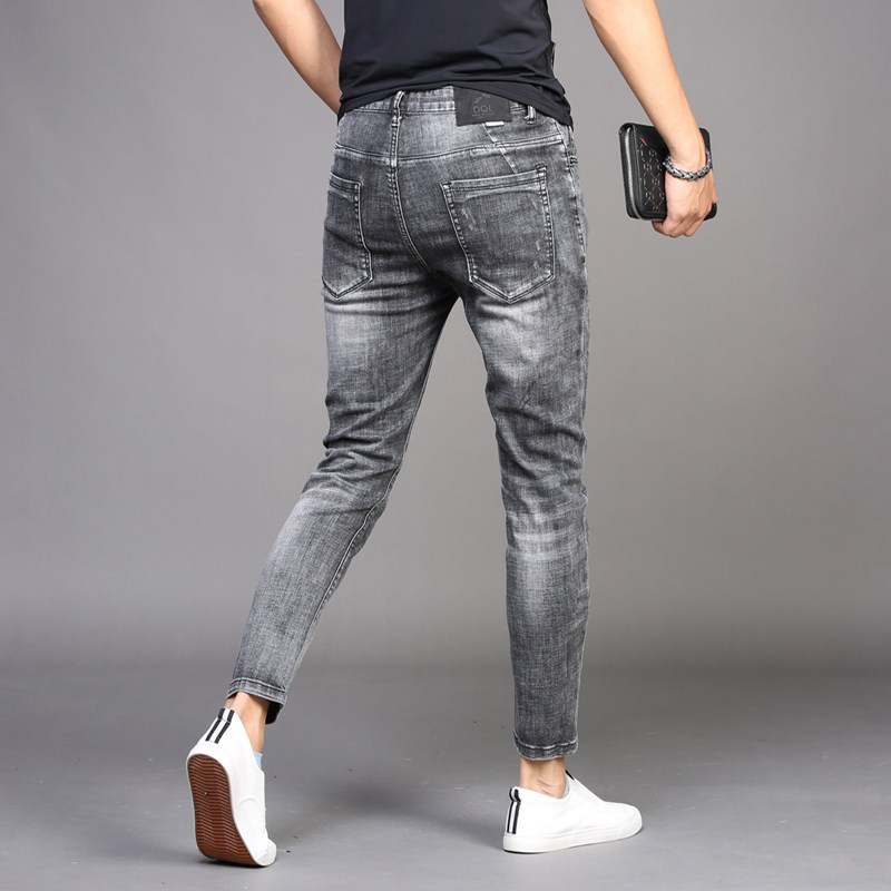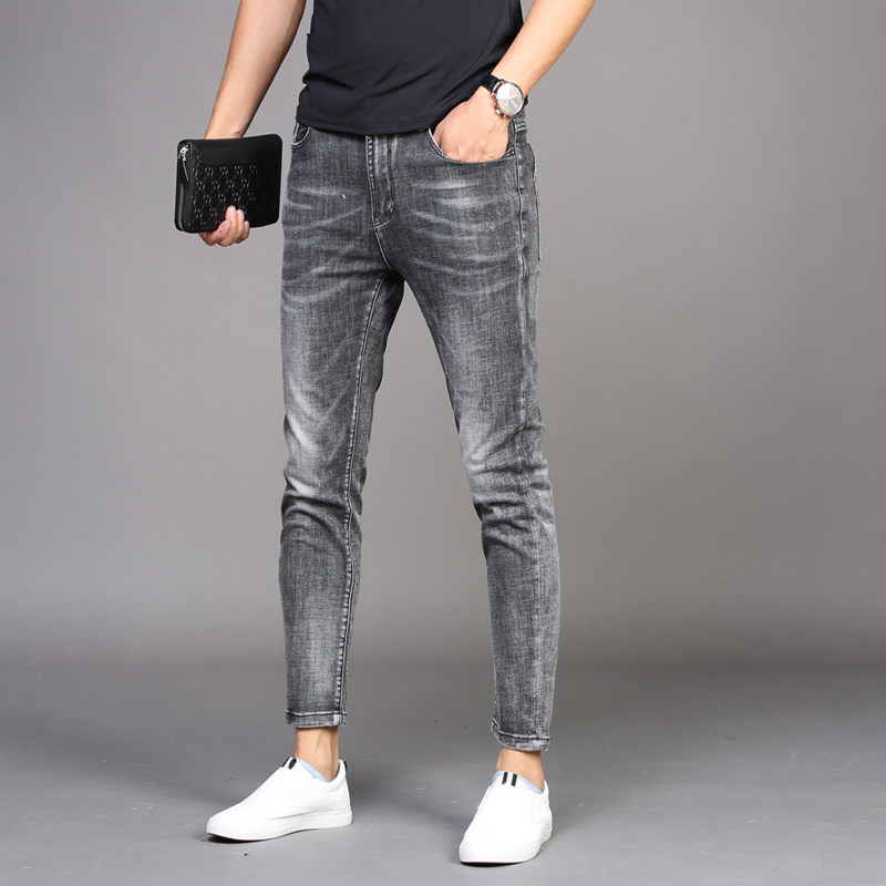 Men's high-end jeans summer thin section smoky gray slim fit feet Korean style trendy casual elastic nine-point pants