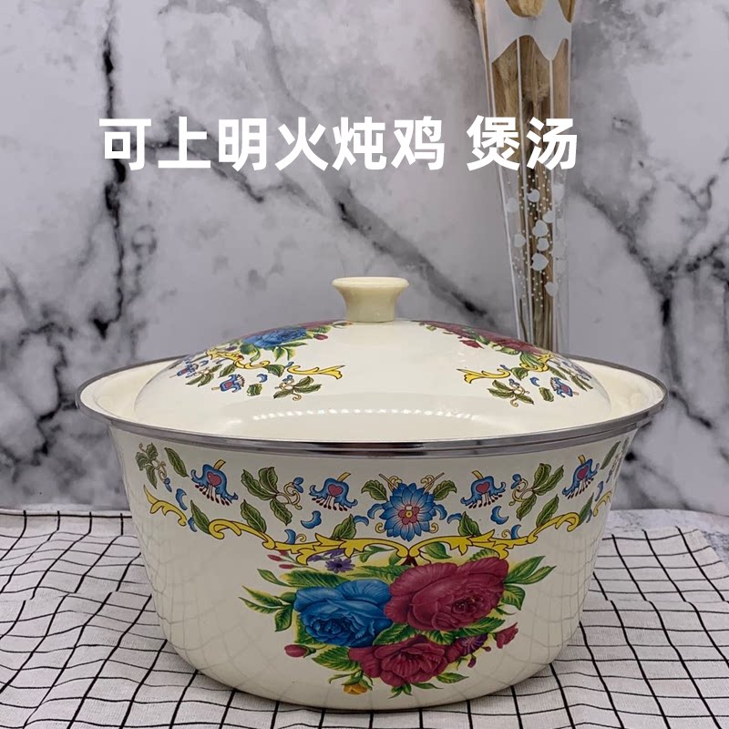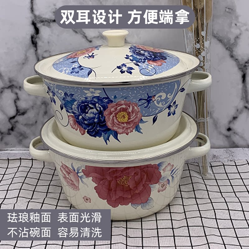 Enamel basin with lid with double ear basin round bowl soup bowl home kitchen with lid old pig oil bowl stirring bowl thickened
