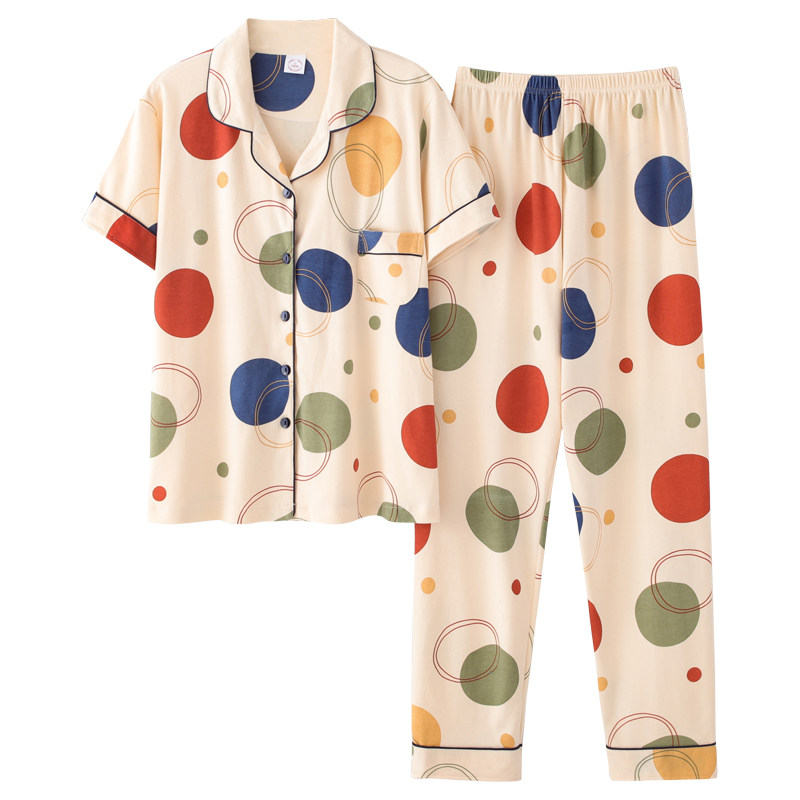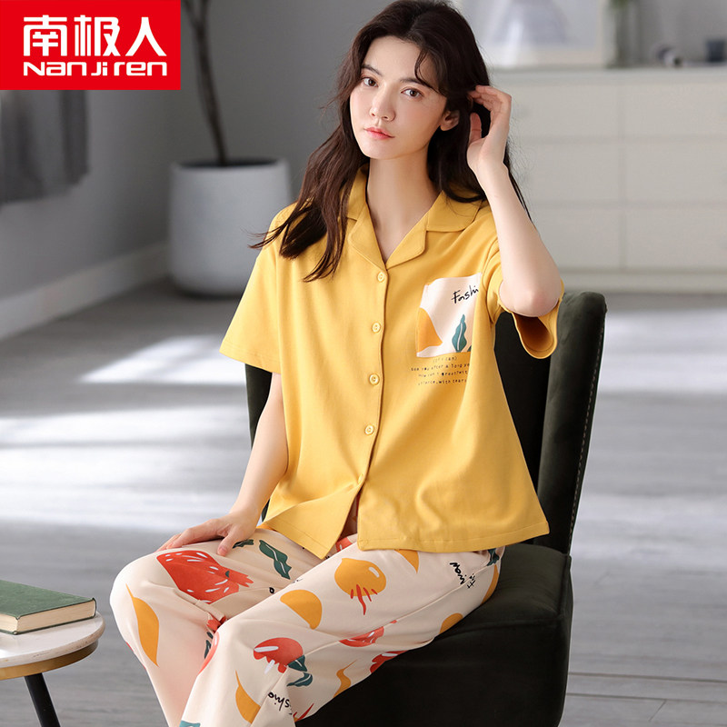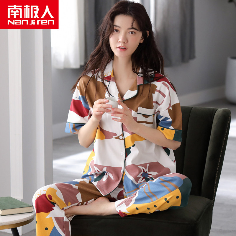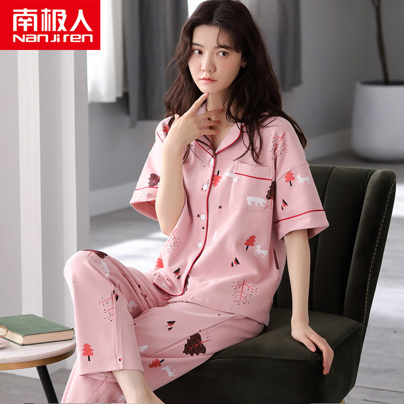 Antarctic pure cotton pajamas women's summer thin short-sleeved trousers Korean cardigan two-piece suit spring and Autumn day home clothes