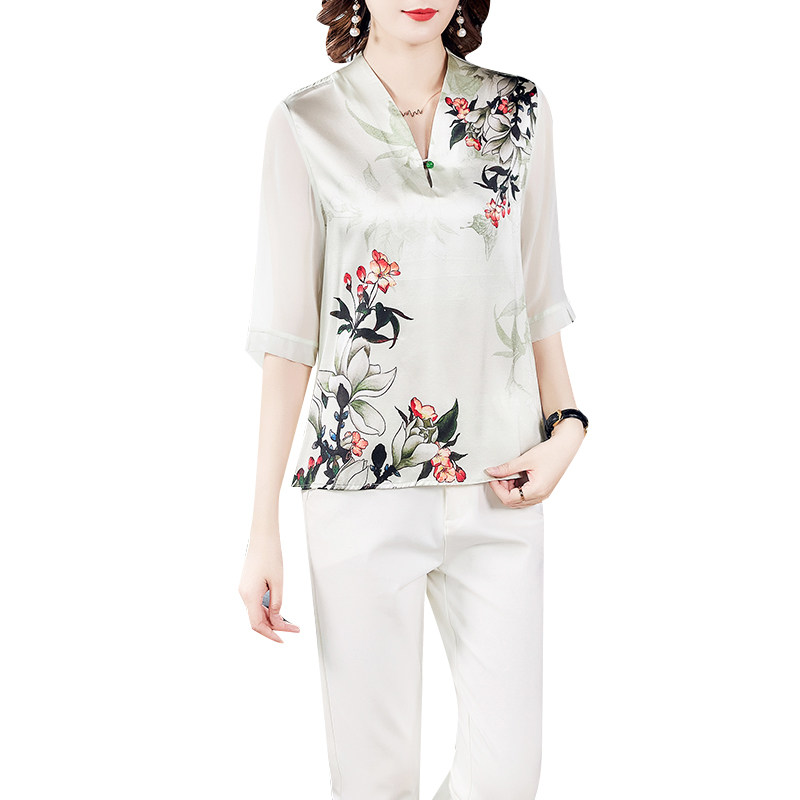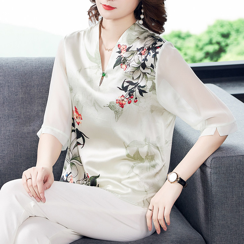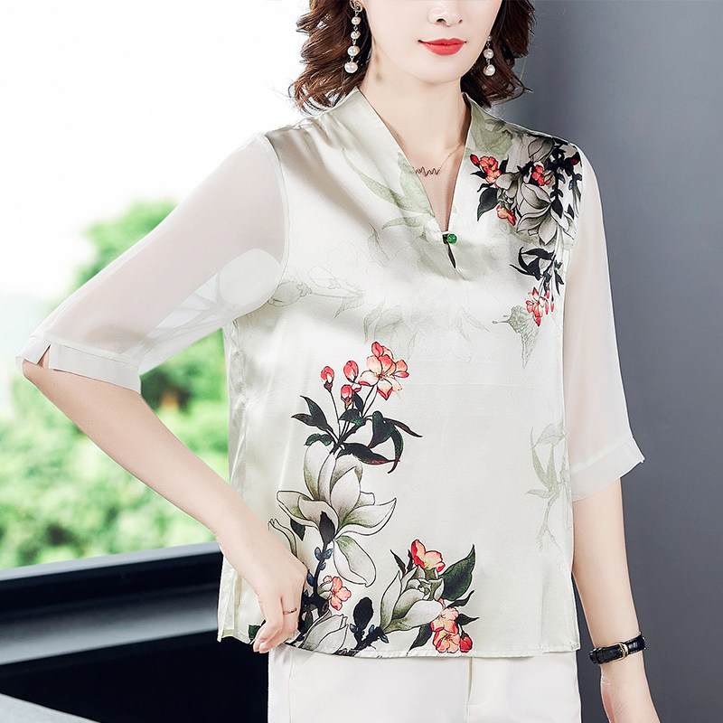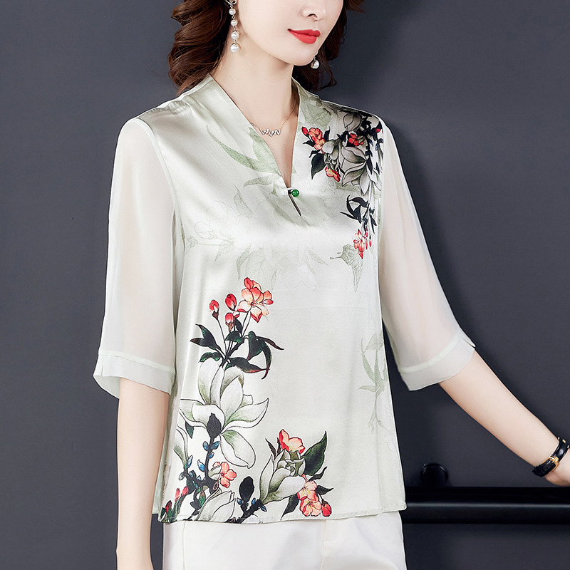 Cheongsam style top 2022 new female silk mulberry silk mother cover belly bottoming small shirt Western style noble fashion