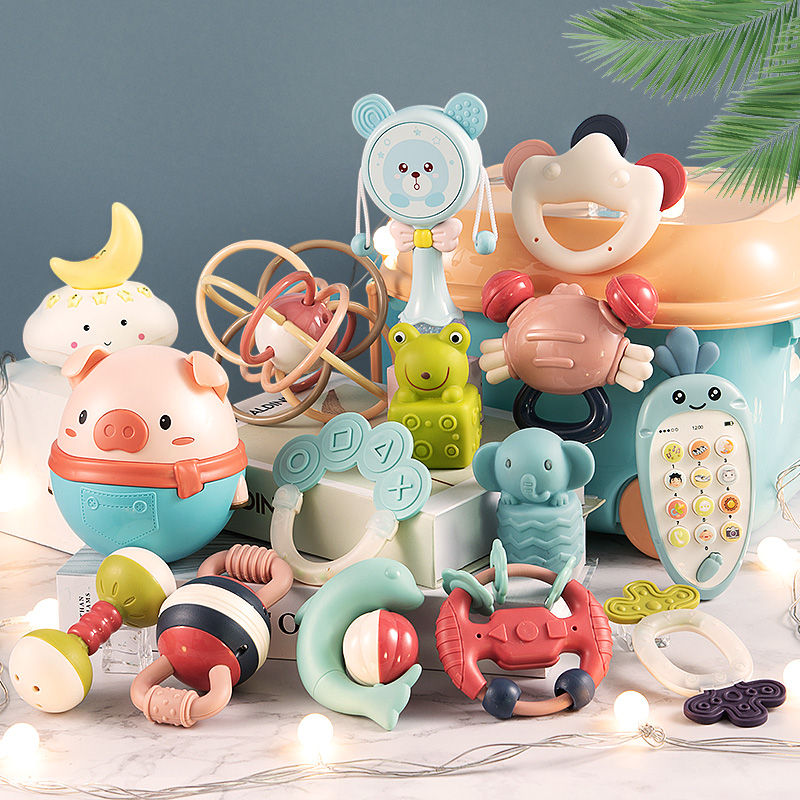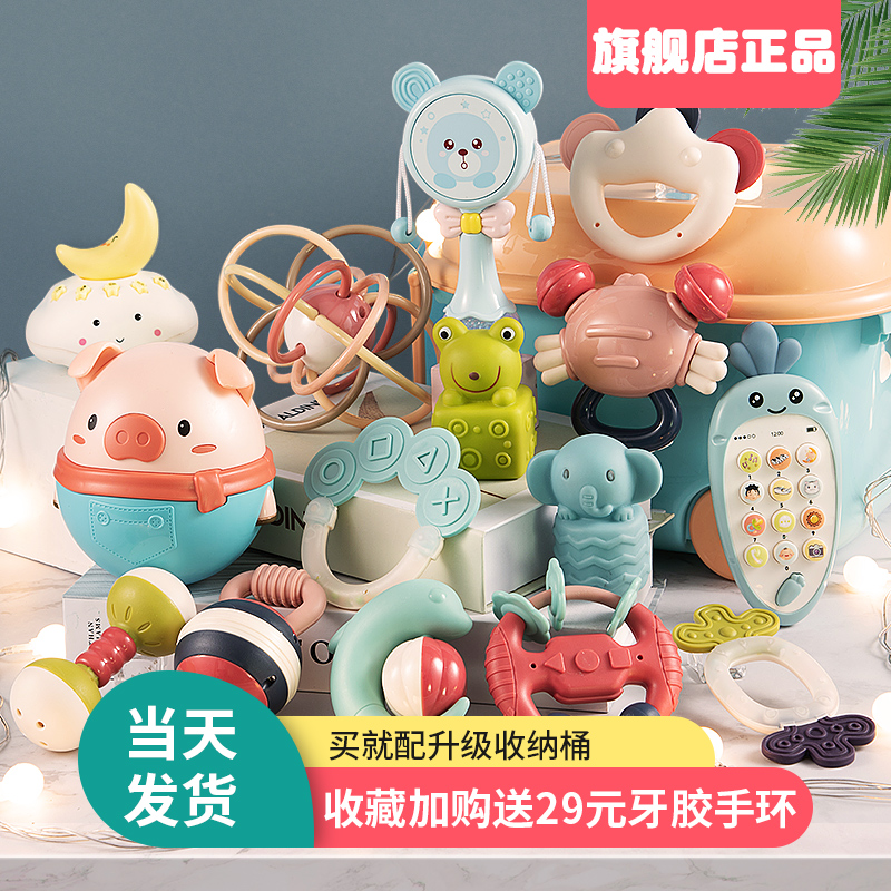 (European and American color music early education puzzle) 11 pieces of sets of rattle-bell solid teeth instrumental music dialer drum (not water-boiled) (European and American color can be boiled) 11 pieces of rattle with Manhattan ball (sent to contain the bucket)