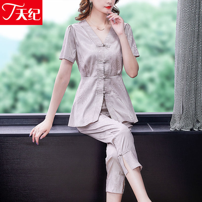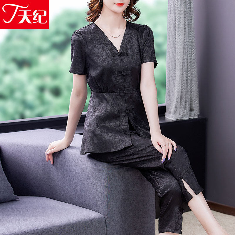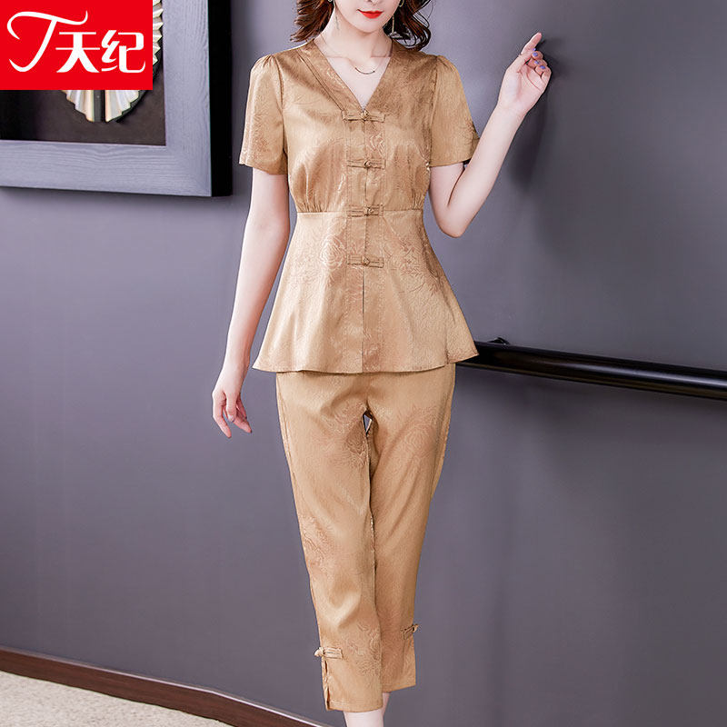 Silk acetic acid suit 2022 new women's clothing noble lady mother summer two-piece suit to cover the stomach and reduce age