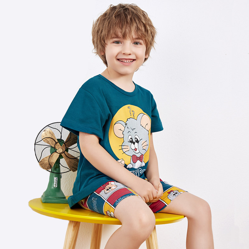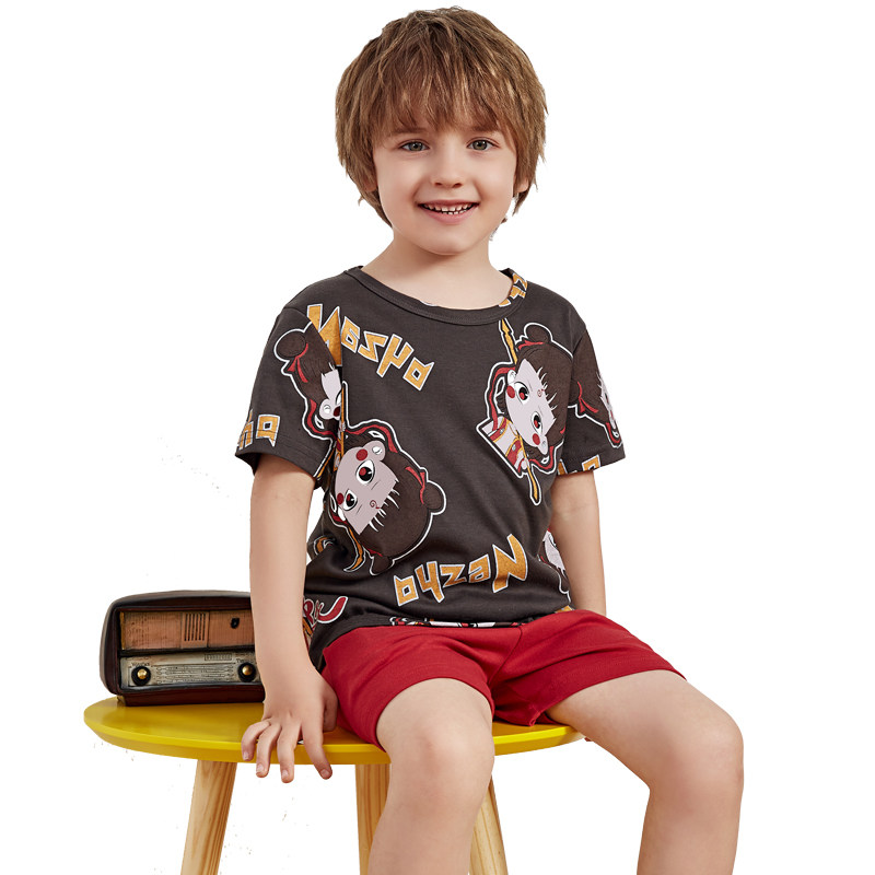 Child Sleepwear Summer Boy Pure Cotton Short Sleeve Cartoon Boy CUHK Boy Baby Summer Thin home Residence Suit Suit