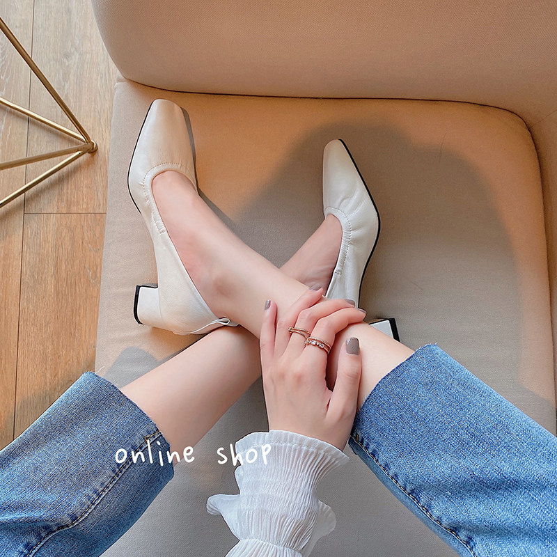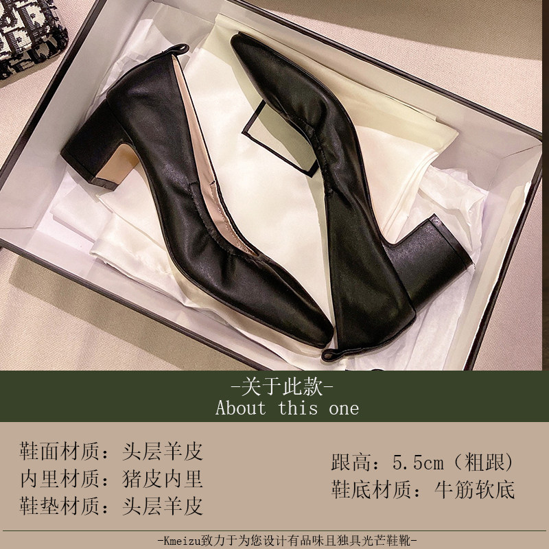 Full leather fried soft ~ French girl high-heeled shoes leather thick heels shallow mouth middle-heeled grandma shoes European goods four seasons OL single shoes