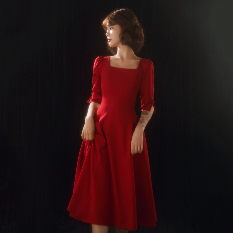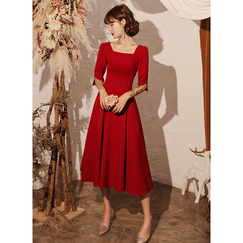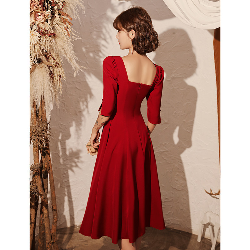 Wine red bride toasting service 2021 new summer wedding atmosphere thin little dress dress in the long