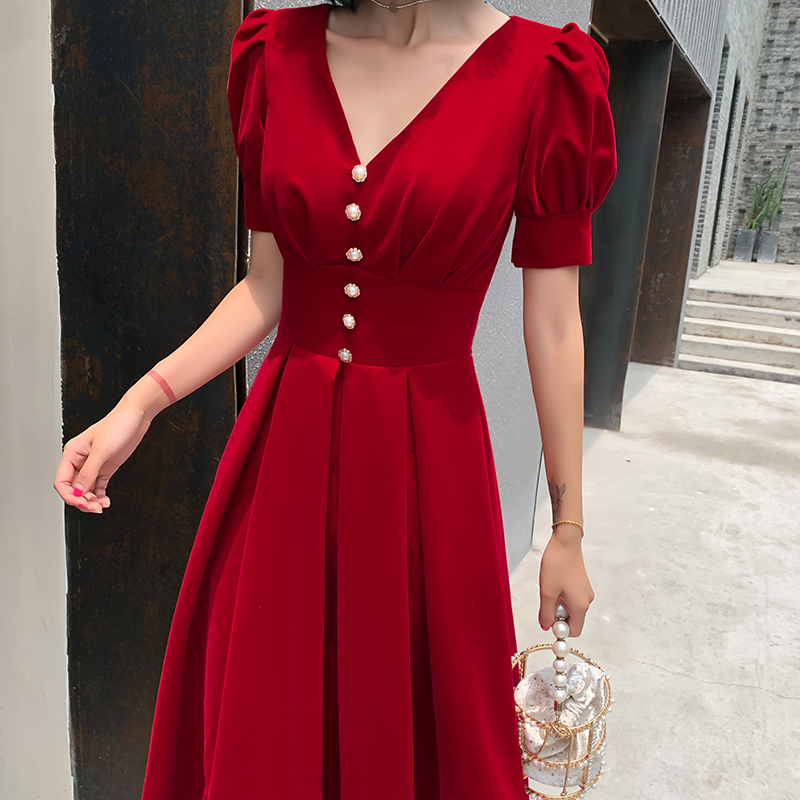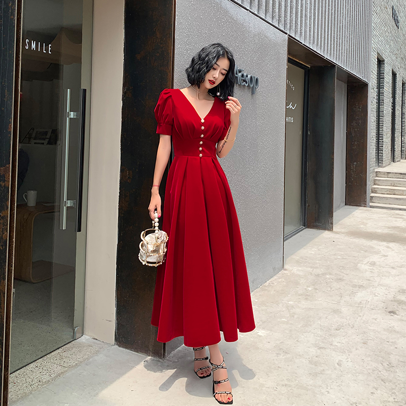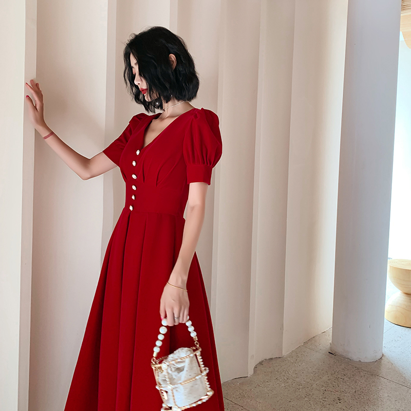 Toast suit 2022 new atmosphere V wine red bride evening dress female high - temperament dinner party back to engagement