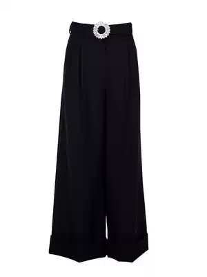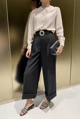 Lin Mei big circle imported diamond buckle high waist waist waist thin wide leg trousers~Thin temperament worsted wool trousers