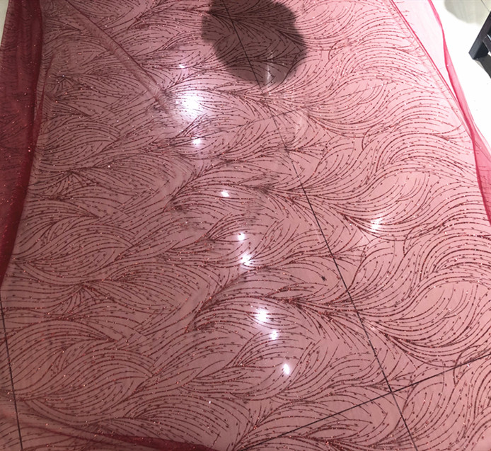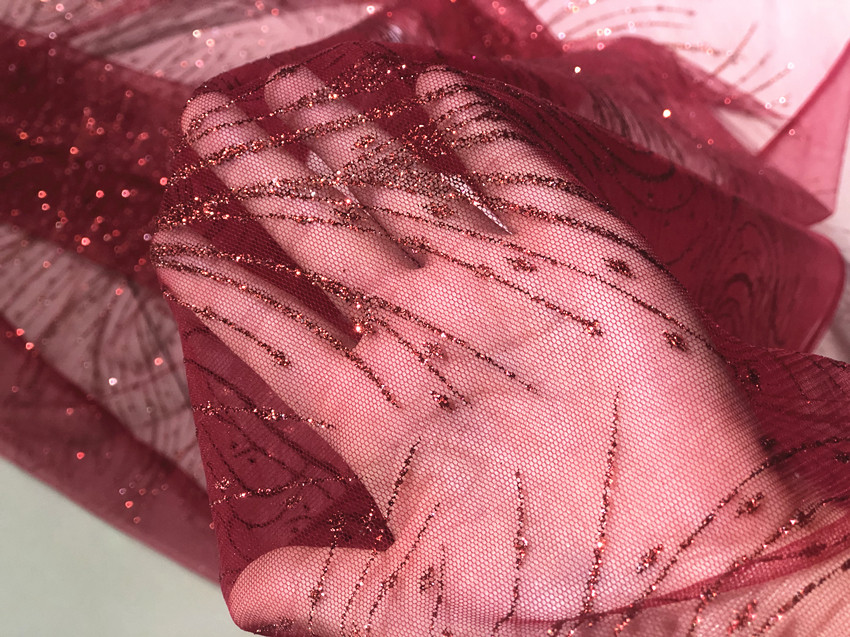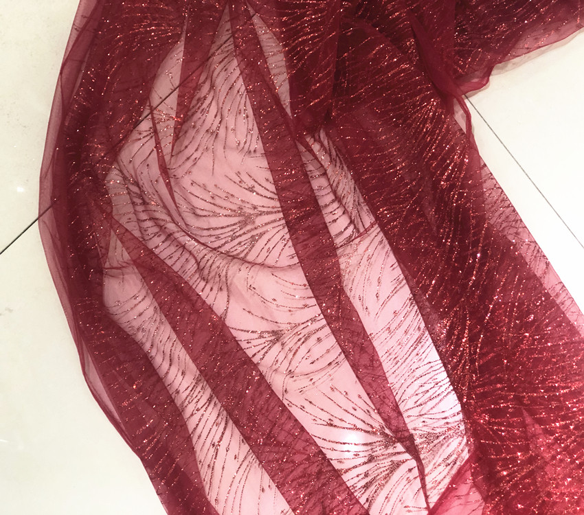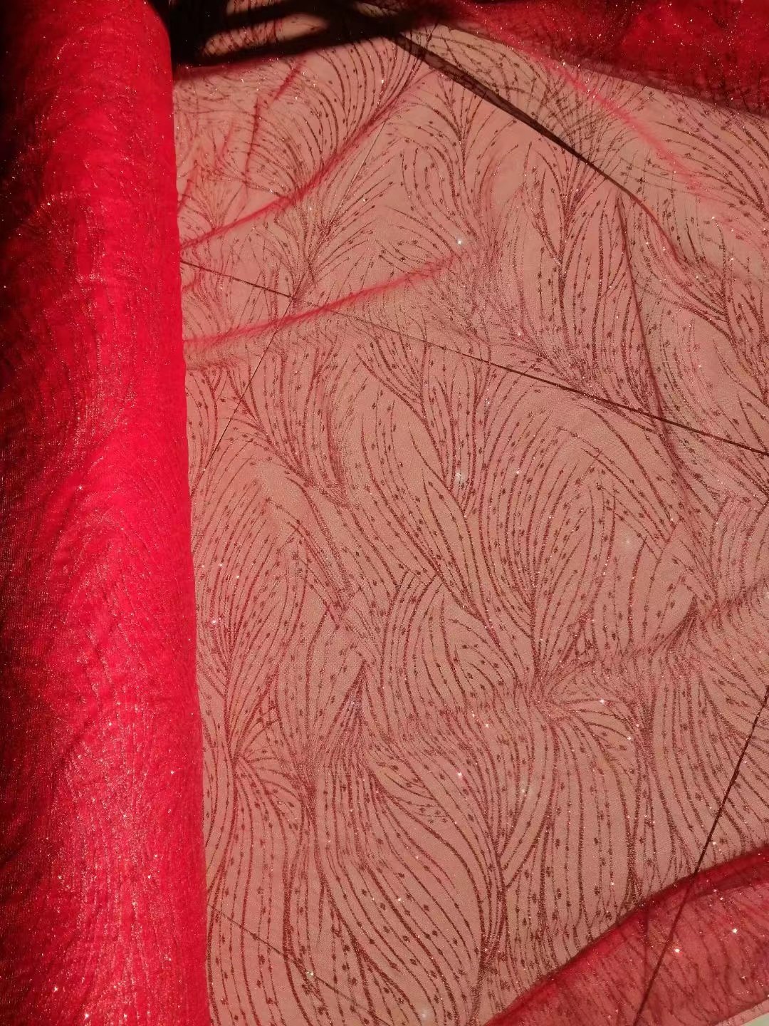 Red tree branch transparent mesh screen shiny wedding dress fabric fabric layout yarn