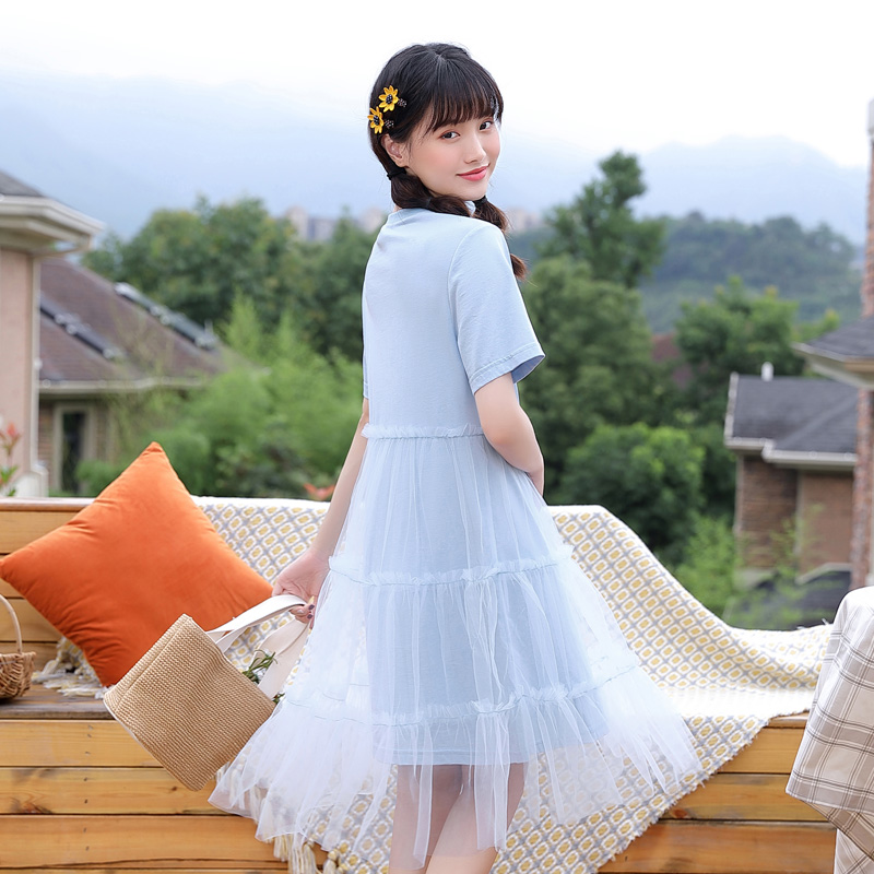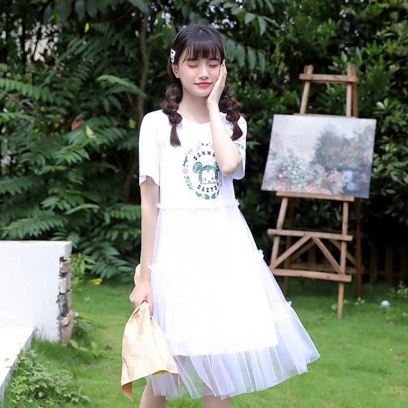 Teenage Girl Foreign Dress Women's Summer Clothing Web Yarn Splicing Short Sleeve Cartoon T-shirt College Wind High School Middle School Student Dresses