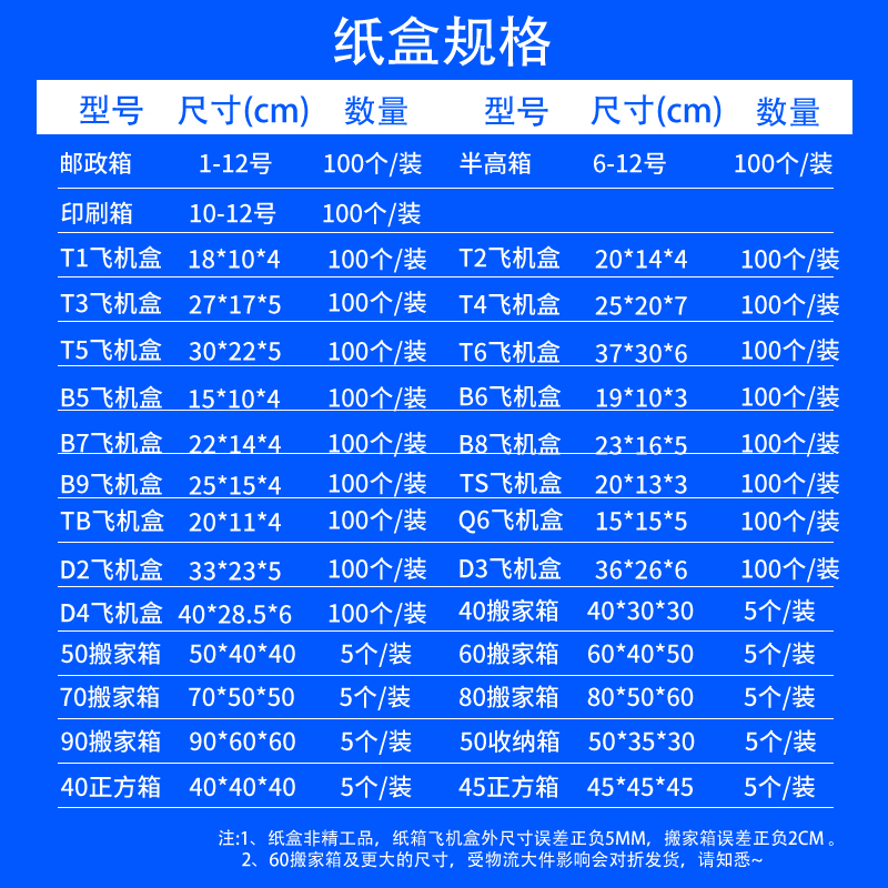 No. 1 (530mmx290mmx370mm) No. 2 (530mmx230mmx290mm) No. 3 (430mmx210mmx270mm) No. 4 (350mmx190mmx230mm) No. 5 (290mmx170mmx190mm)No.6(260mmx150mmx180mm)No.7(230mmx130mmx160mm)No.8(230mmx130mmx160mm)No.8 210mmx110mmx140mm)9(195mmx105mmx135mm)10(175mmx95mmx115mm)111(145mmx85mmx105mm)12(130mmx80mmx90mm)T2(200mmx140mmx40mm)T3(270mmx165mmx50mm)Airplane Box(B5 -15*10*4CM)Aircraft Box(B6 -- 19*10*3CM) Airplane Box (B7 22*14*4CM) Airplane Box (B8 23*16*5CM) Airplane Box (B9 25*15*4CM) Airplane Box (TS-20*13*3CM) Airplane Box (TB-20*11*4CM) Airplane Box (T1-18*10*4CM) Airplane Box (T4-25*20*7CM) Aircraft Box (T5- 30*21*5CM) Airplane Box (T6-37*30*6CM) Airplane Box (Q6-15*15*5CM) Airplane Box (D2-33*23*5CM) Airplane Box (D3-36*26*6CM) Airplane Box (D4-40*28. 5*6CM) Moving Box (40*30*30CM) - 5 Moving Boxes (50*40*40)-5 PackIng Boxes (60*40*50CM) - 5 Moving Boxes (70*50*50CM) - 5 Moving Boxes (80*50*60CM) - 5 Moving Boxes (90*60*60CM) - 5 Packing Boxes (50*35*30CM) - 5 Packing Boxes (40*40*40CM) - 5 Packing Boxes (45*45* 40CM) - 5 Packing Boxes (45*45* 45CM) - 5 packs