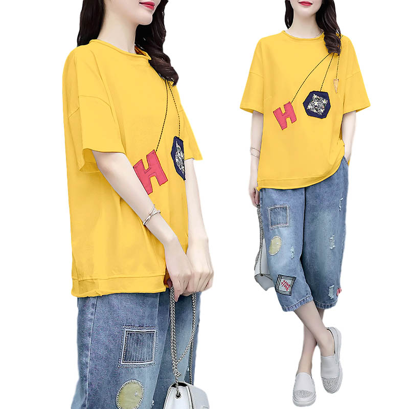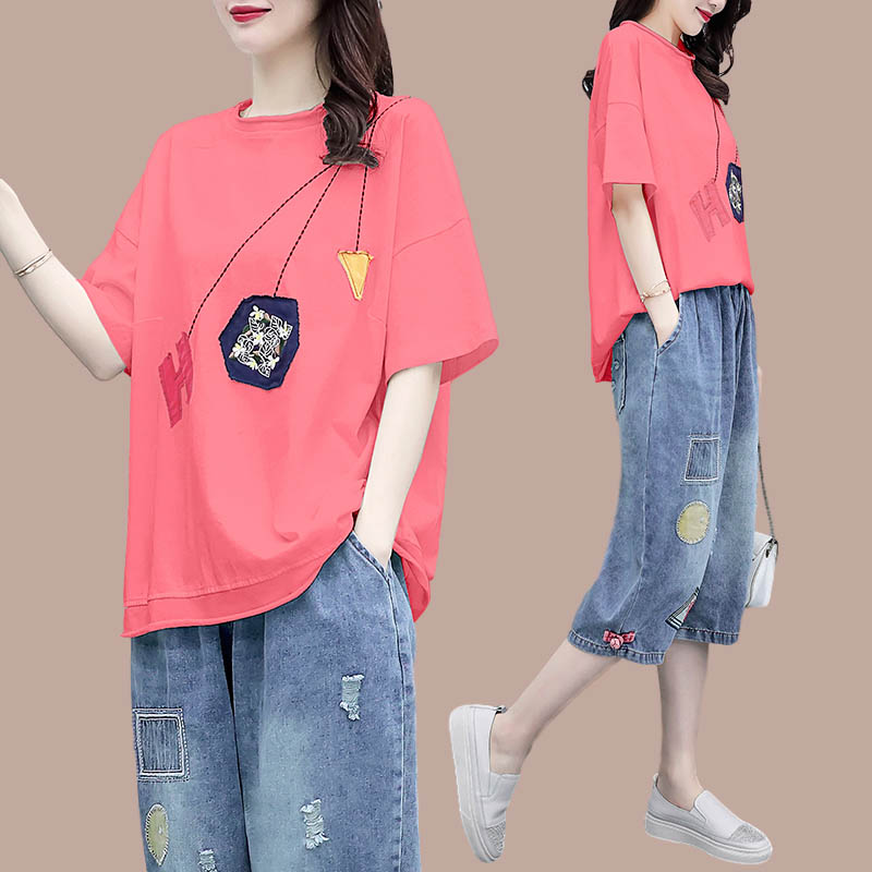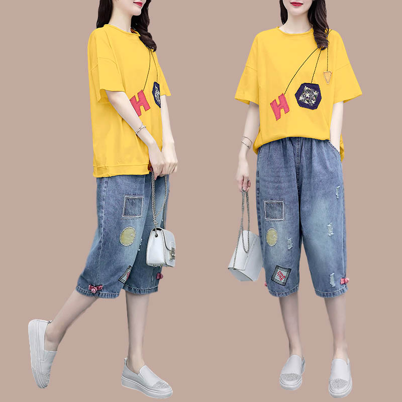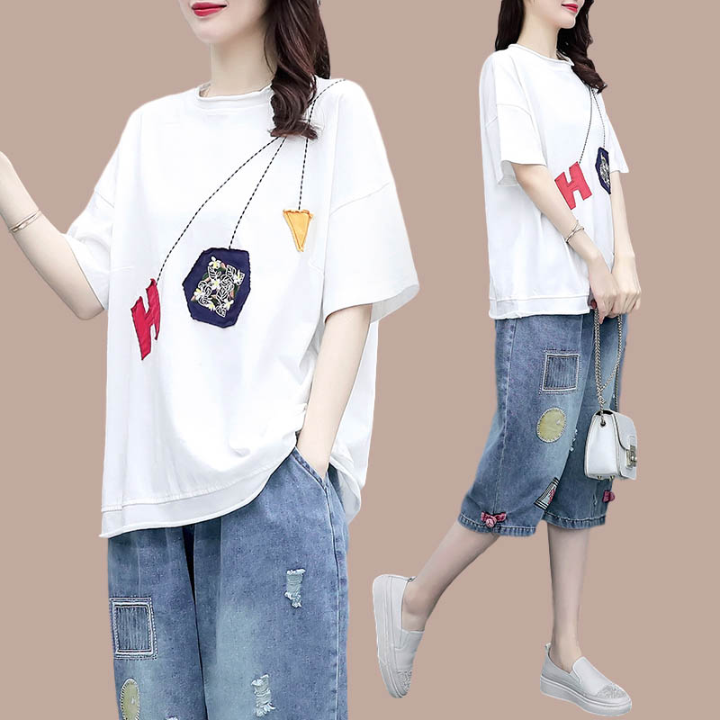 Fashion casual loose T-shirt cotton short-sleeved seven-point jeans two-piece suit women's summer dress 2022 new Western style