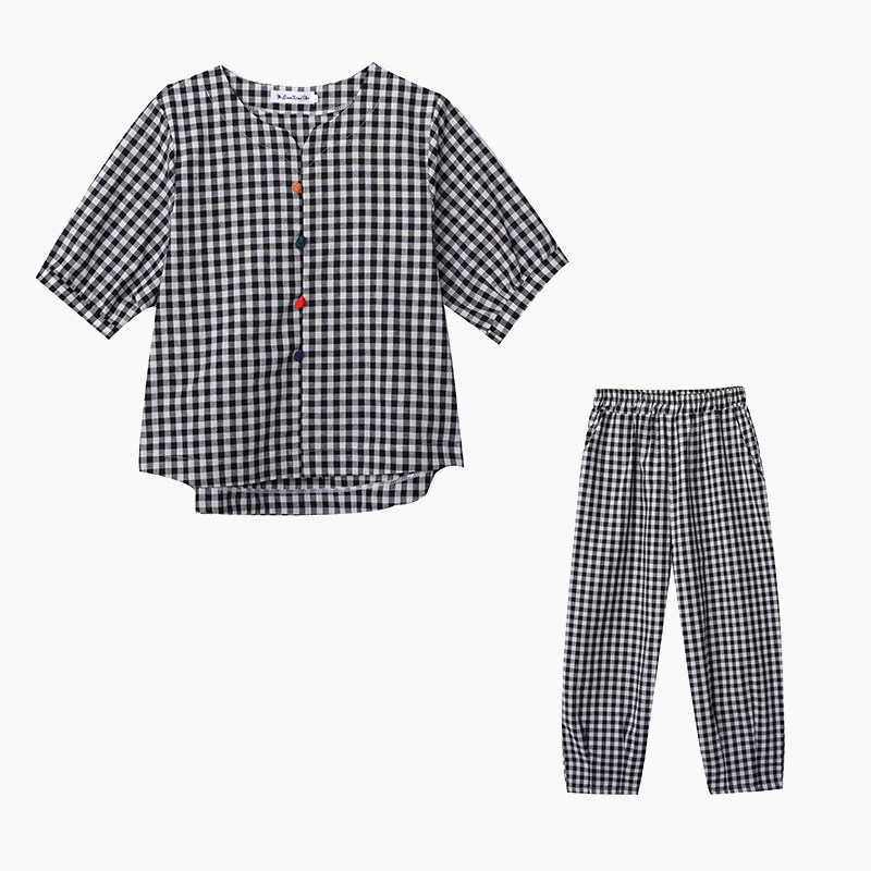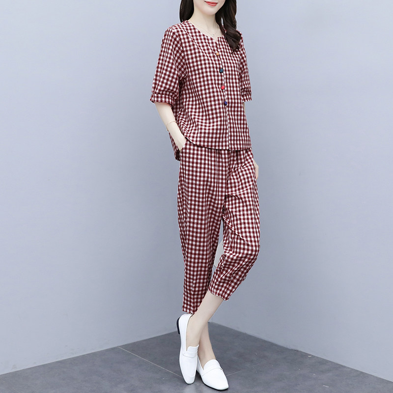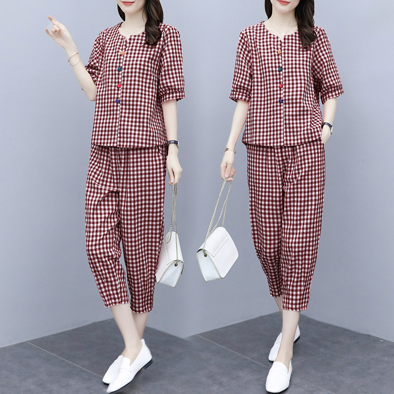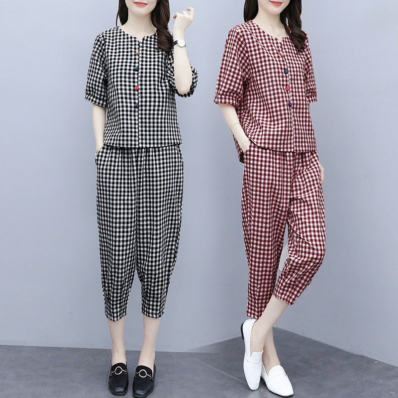 2023 summer new plus size women's cotton and linen suit short sleeve plaid top casual cropped pants two-piece suit
