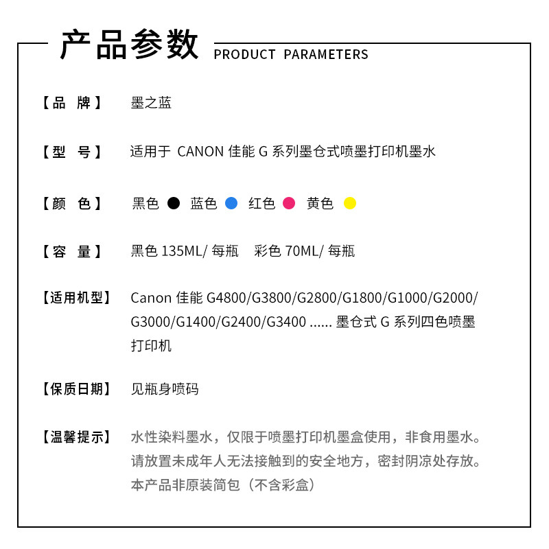 Black BK 135ML (Color box)Blue C 70ML (Color box)Red M 70ML (color box)Yellow Y 70ML (color box)Four-color set (color box)