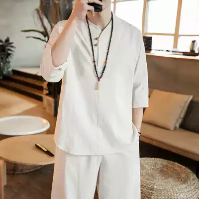 Summer Chinese style cotton and linen suit Men's large size embroidered Buddhist lay clothes Men's retro Hanfu five-point sleeve two-piece suit