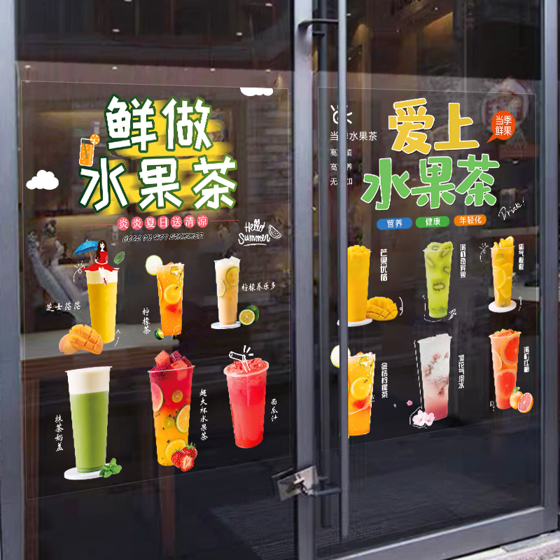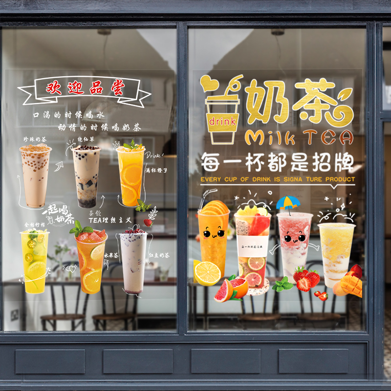 Milk tea glass stickers Hamburg shop window door decoration wall stickers self-adhesive poster creative fruit tea stickers transparent stickers