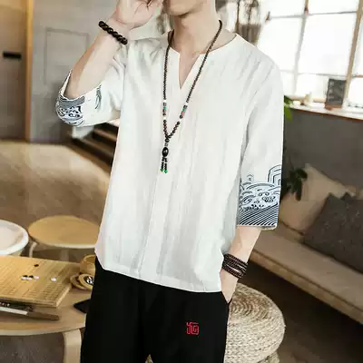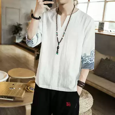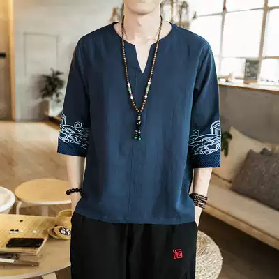 Summer Chinese style linen embroidered men's T-shirt youth five-point sleeve lay suit Loose large size Chinese cotton and linen short sleeves