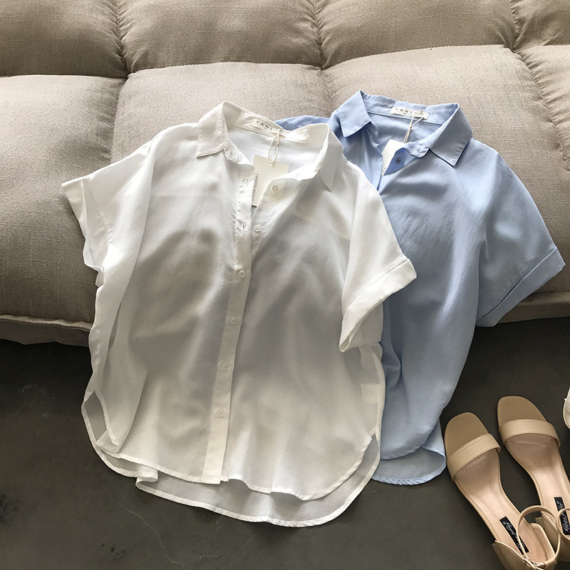 Tencel short-sleeved shirt female slim casual temperament 2023 summer new Korean version retro solid color loose top