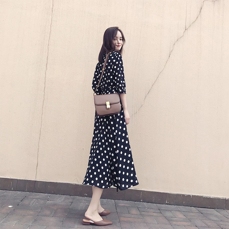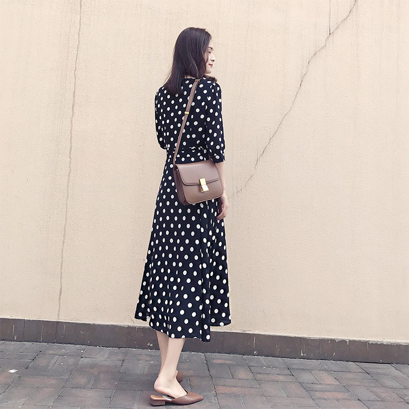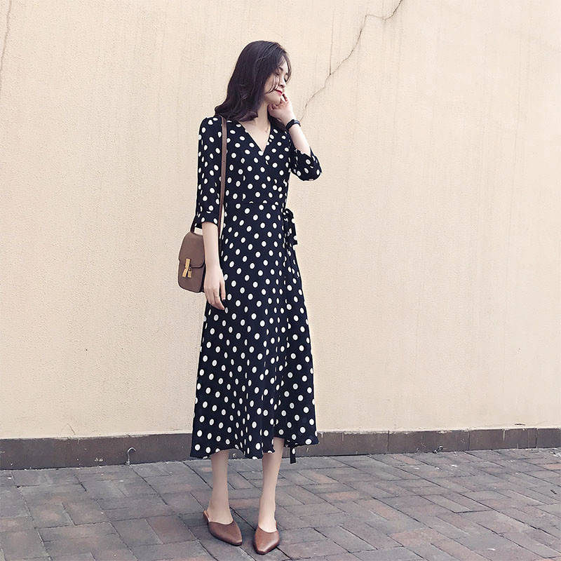 Chiffon polka dot dress women's 2022 summer new Korean version of the V-neck waist slim temperament three-quarter sleeves little black dress
