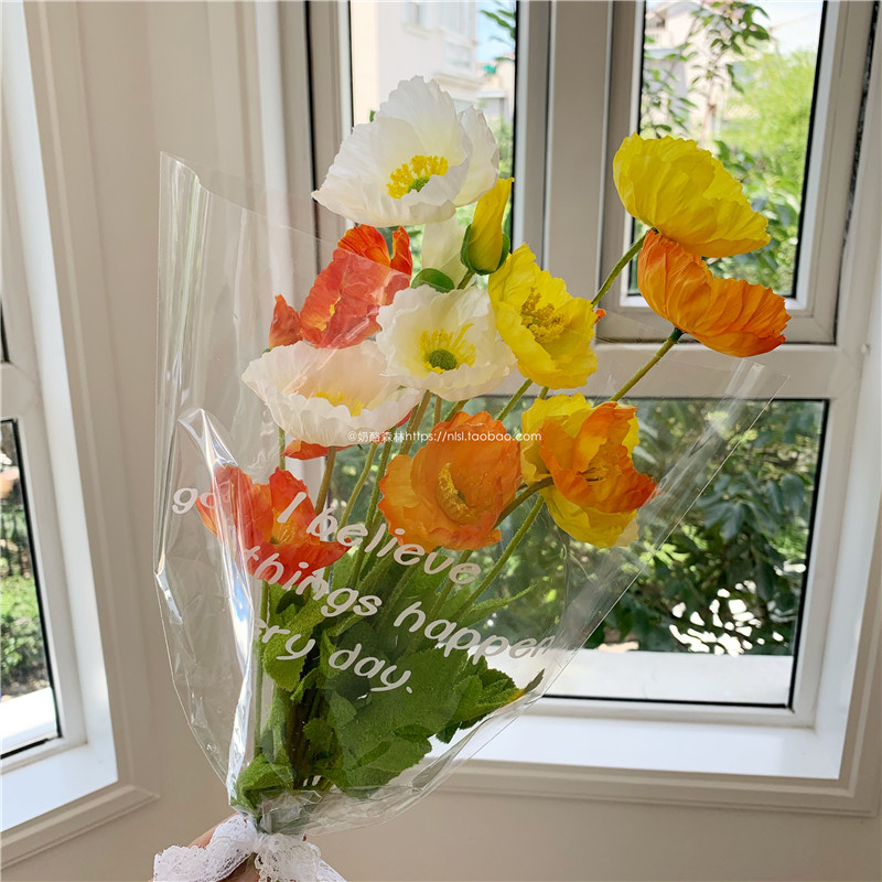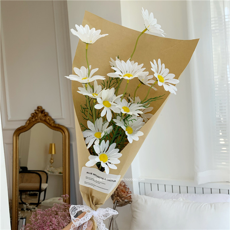 12 tulips, transparent bag, ribbon, three white daisies, kraft paper, ribbon, three yellow daisies, kraft paper, ribbon, five white daisies, transparent bag, ribbon, five yellow daisies, transparent