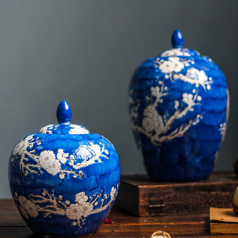 Chinese blue and white porcelain hand-painted storage jar with lid decoration decoration ceramic large storage jar living room porch decoration