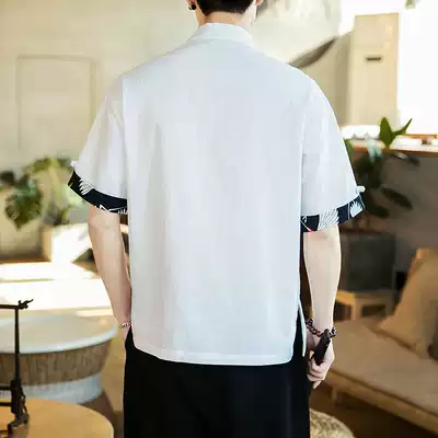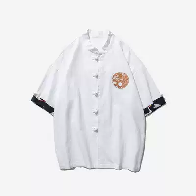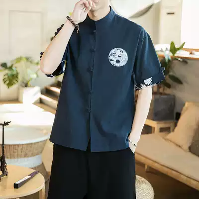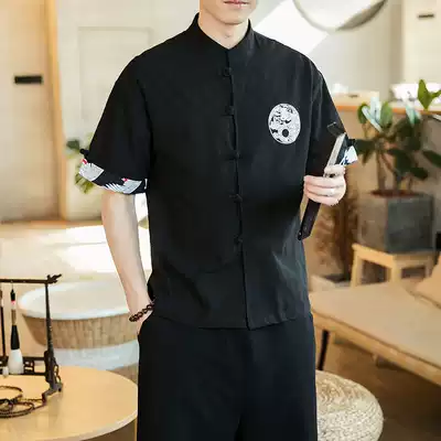 Chinese style embroidered linen shirt Men's short-sleeved summer national style Buddhist cotton and linen large size shirt casual meditation clothes