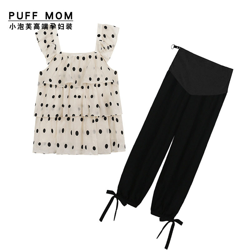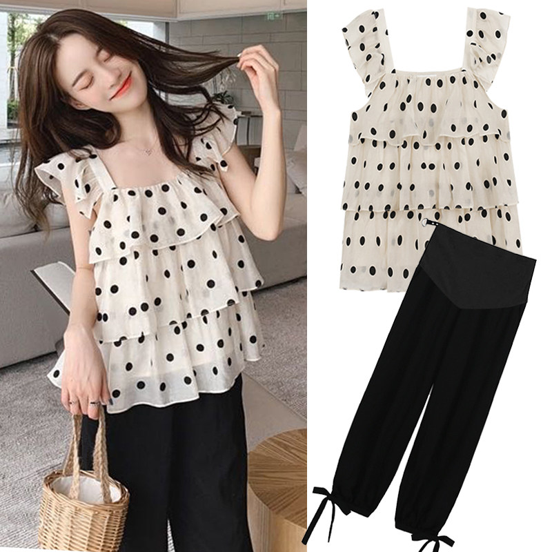 Pregnant women spring and summer clothing set out Fashion Net red summer wave point camisole small fragrant wind chiffon shirt top