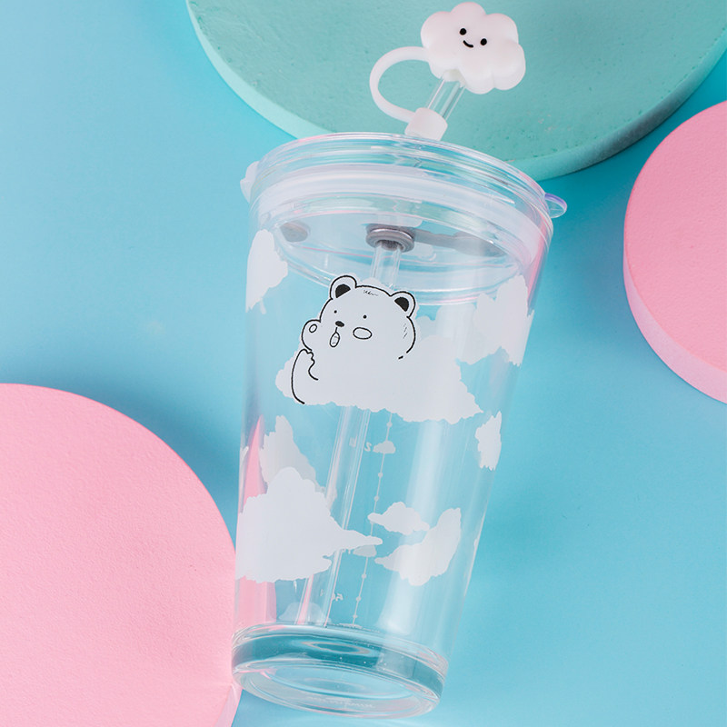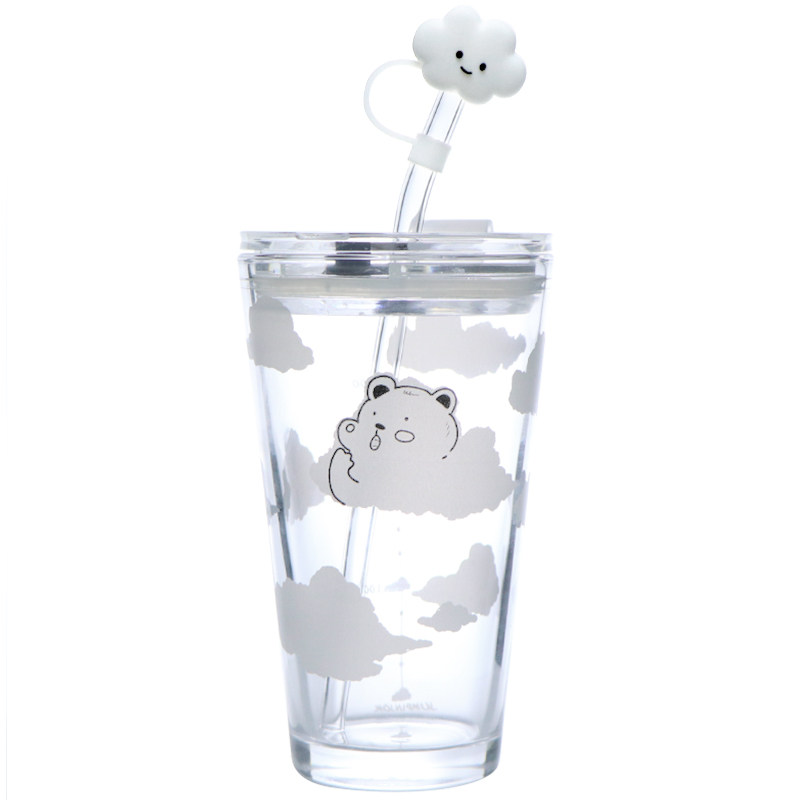 Cloud bear cover silicone straw Cloud bear cover cup cover Glass straw Cloud bear-White cloud cap set Cloud bear-Cherry blossom spoon set Cloud bear-full set(a total of 8 pieces drink more water-white cloud cap set