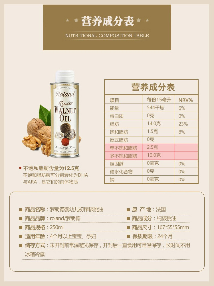 French original imported Roland Rolande baby DHA walnut oil for early juicing cooking oil 250ml