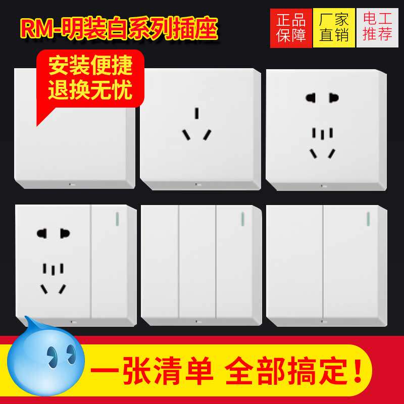 Ming fit a single control switch Ming-fit two single control switch Ming-fit three single control switch Ming fit a double cut switch Ming fit three-pole socket 16A Ming fit five-hole socket 10A Ming fit open single with five holes socket