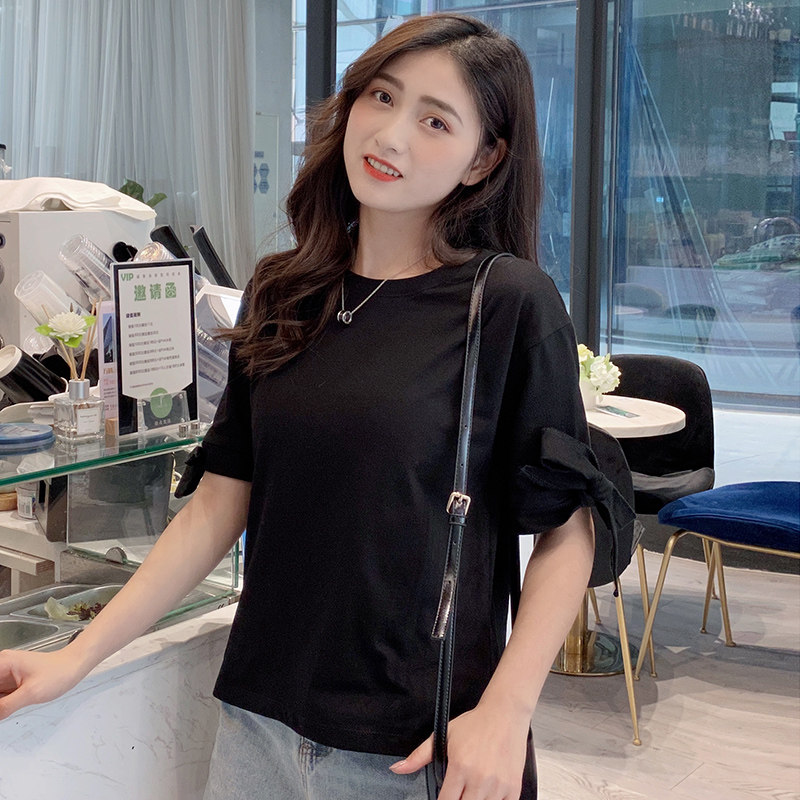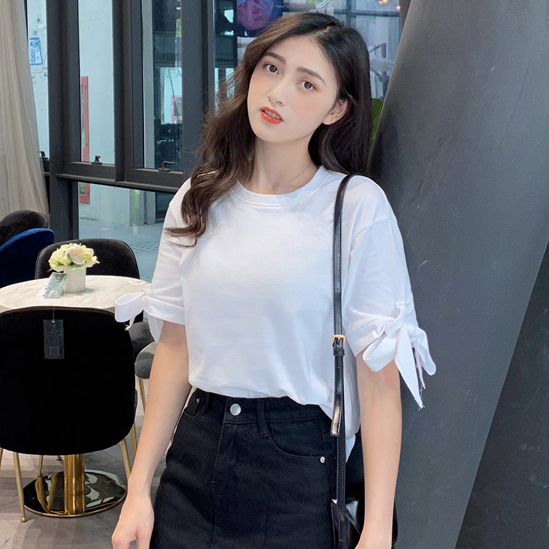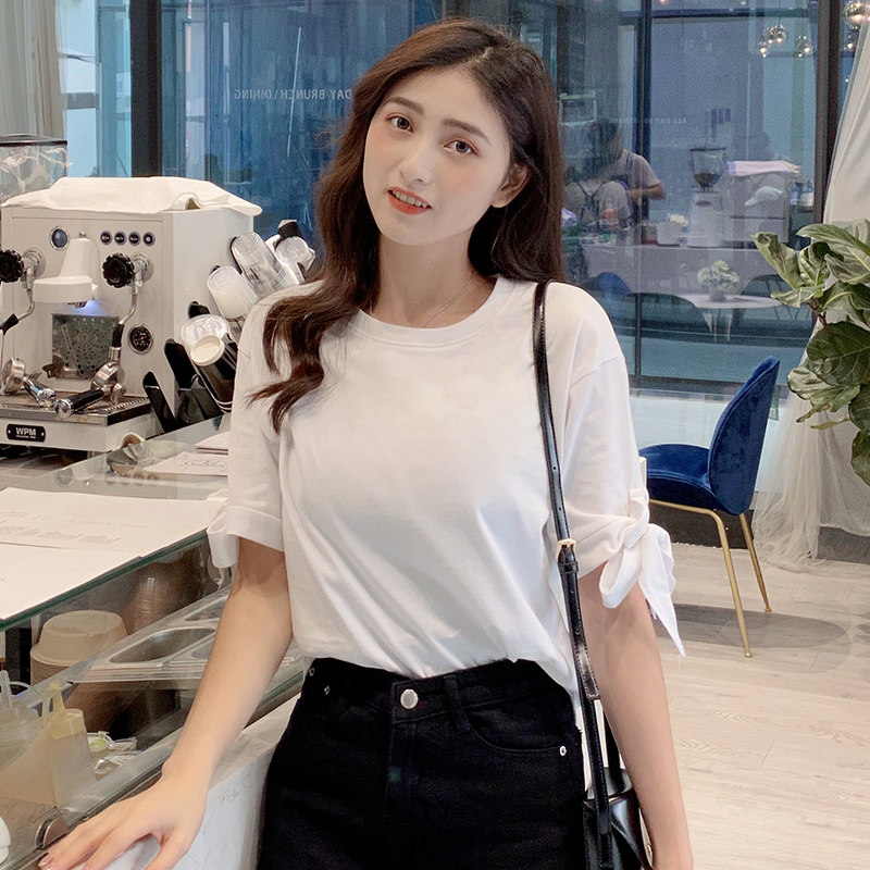 short sleeve t-shirt female summer new 2022 Korean version loose full cotton 100 lap collar blouse damp strap open fork cuff