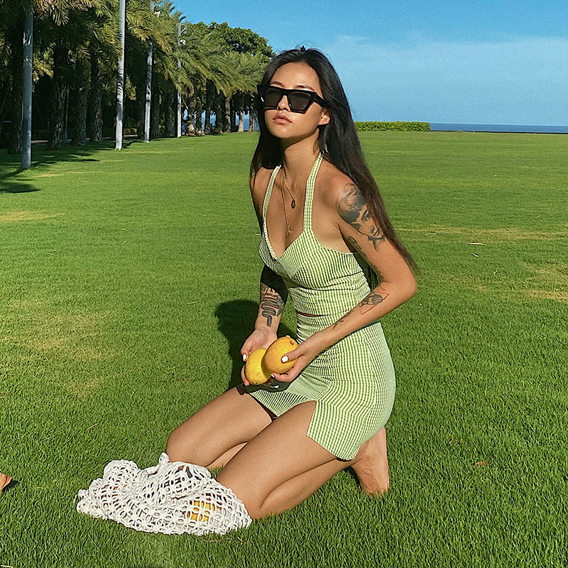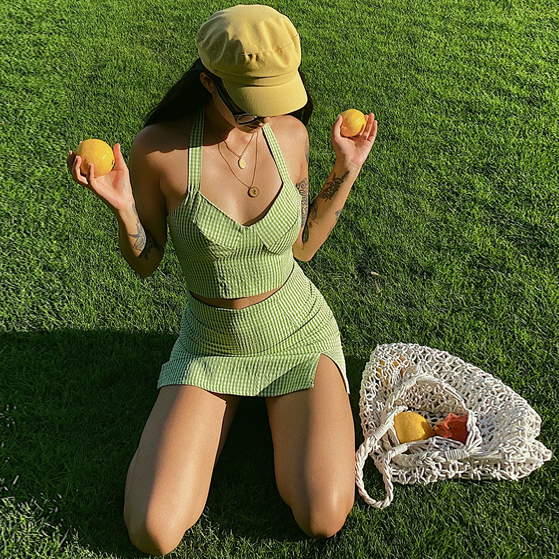 Plaid extras for summer frescoed green retro style hanging neck harness bag dress sexy blouse A word dress Two sets