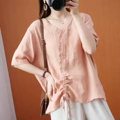 Summer literary drawstring hemp top Joker casual thin solid color v-neck short sleeve t-shirt women loose cotton linen shirt