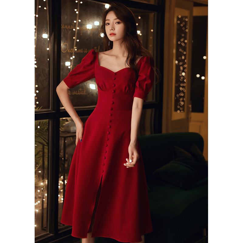 The bride's engagement toast can wear a wine-red split dress dress dress, the little woman's summer dress looks thin.