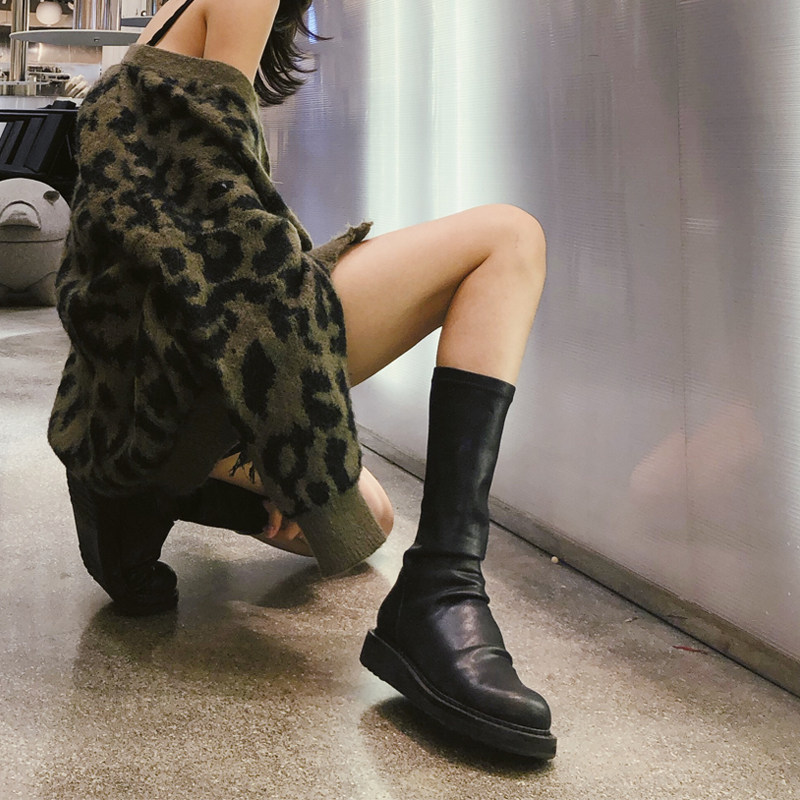Net red short boot slim and thin thick bottom elastic boot 2021 autumn winter new round head though kneecap boot handsome flat-bottomed boots