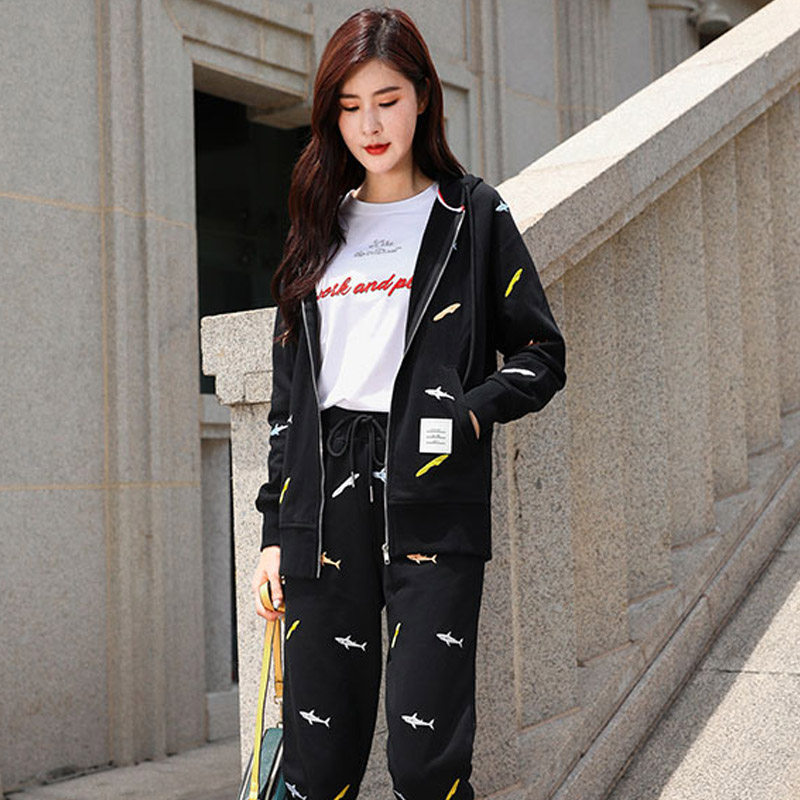 Shark embroidery Rnecklace sweatpants Trousers Tide Card Sport Suit Women Loose couple's jacket long pants Two sets