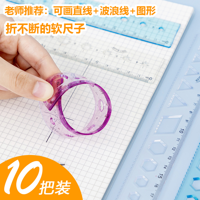 Elementary school ruler with wavy line soft ruler student stationery multi-function protractor 15cm ruler transparent 20cm children's measurable curve anti-break grid drawing with graphic drawing measurement tool