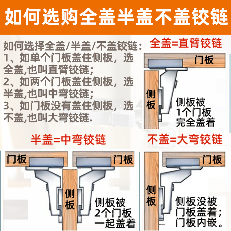 1 (thick door quick fit hinge) full cover straight arm hinge 2 (hinge damper) full cover straight arm applicable 3 (thick door quick fit hinge) half-cover mid-bend hinge 4 (hinge damper) half-cover mid-bend apply 5 (