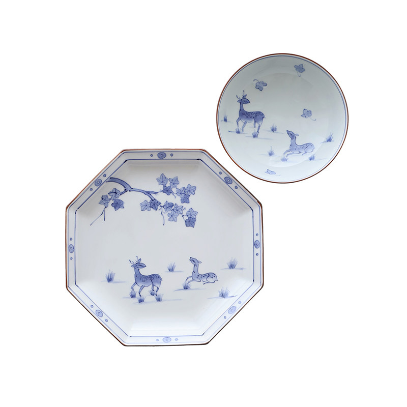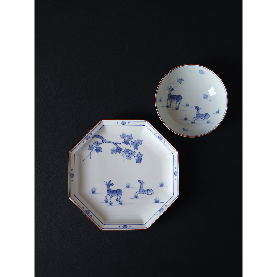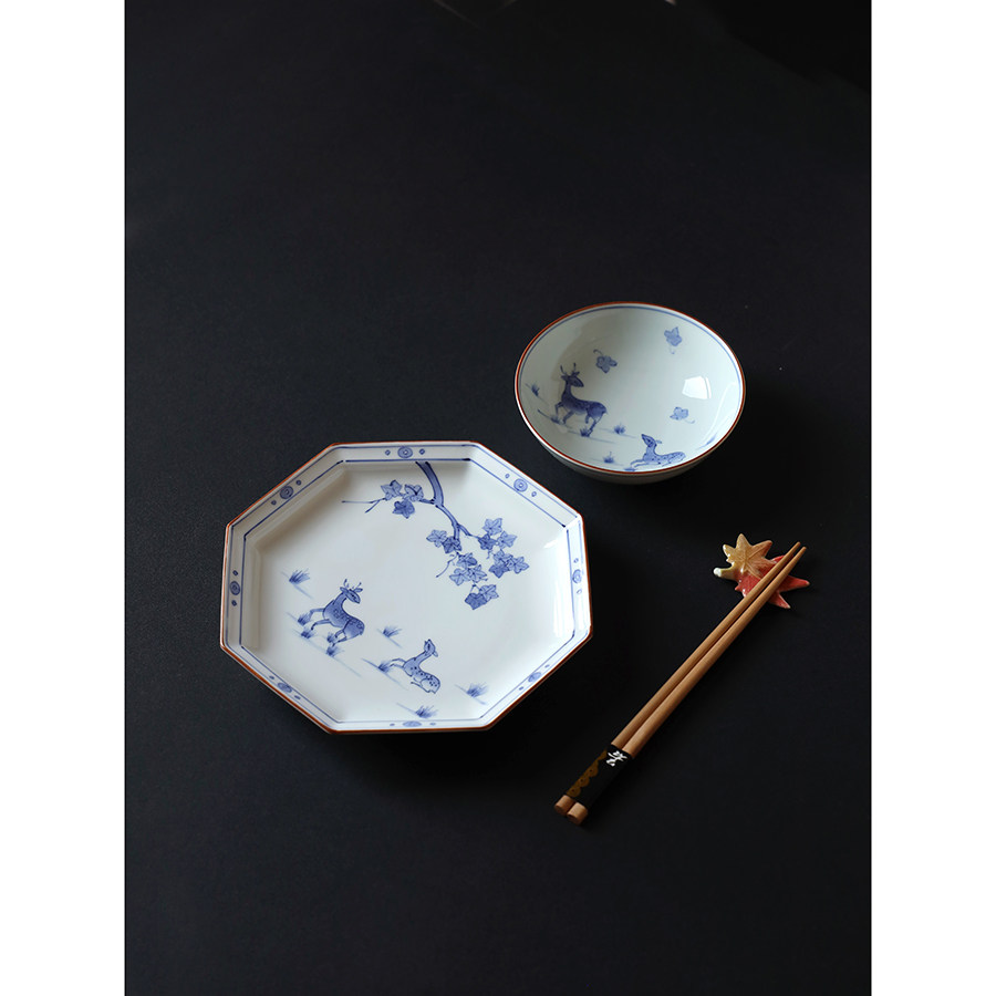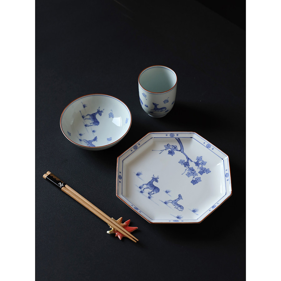 Japanese-made imported Arita-yaki hand-painted blue and white deer figure star anise sunflower mouth large plate bowl tea cup Japanese tableware