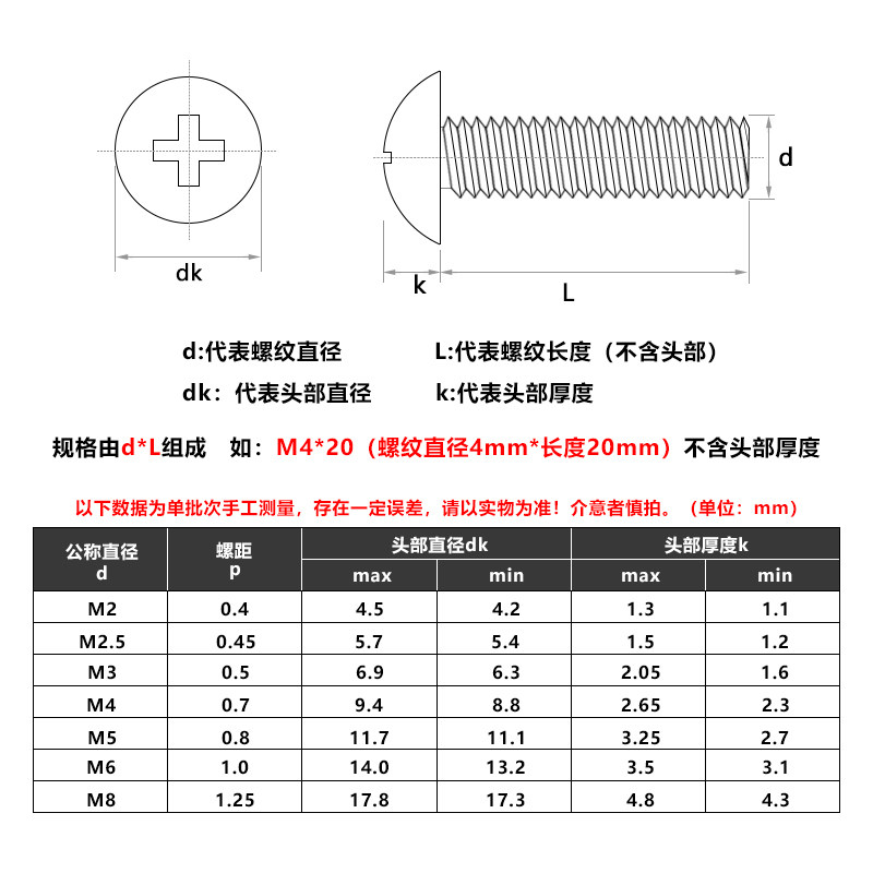 201 stainless steel cross large flat head screw bolt TM large head M3M4 * 6x8x10x16x20x30x50mm
