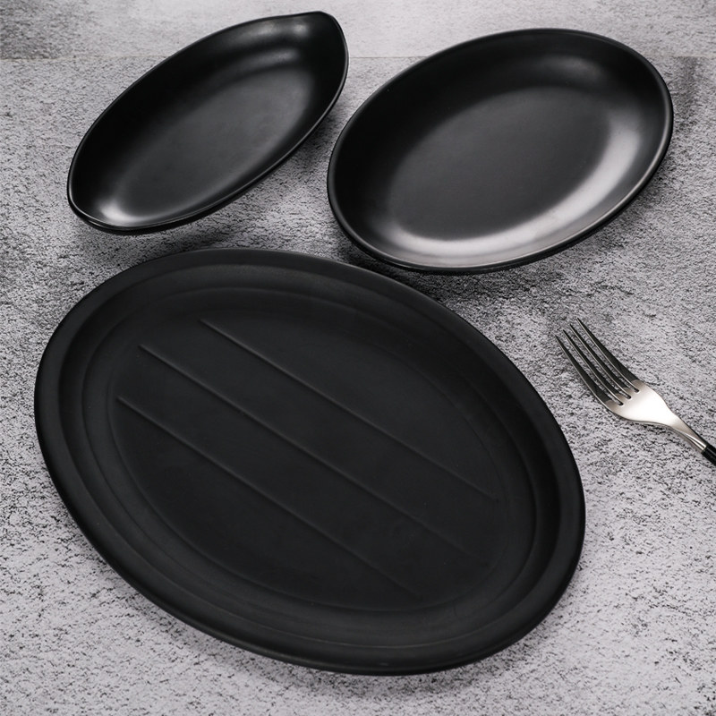 Melamine hot pot restaurant vegetable plate oval sausage powder plate black boat-shaped plate creative fish plate restaurant cooking plate commercial