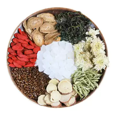 Chrysanthemum cassia seed, wolfberry, honeysuckle, licorice, burdock root, dandelion single crystal rock sugar