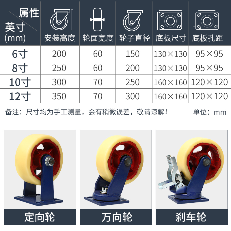 6-inch orientation wheel 6 inch universal wheel 6 inch brake wheel 8 inch orientation wheel 8 inch universal wheel 8 inch brake wheel 10 inch orientation wheel 10 inch universal wheel 10 inch universal wheel 10 inch brake wheel 12 inch