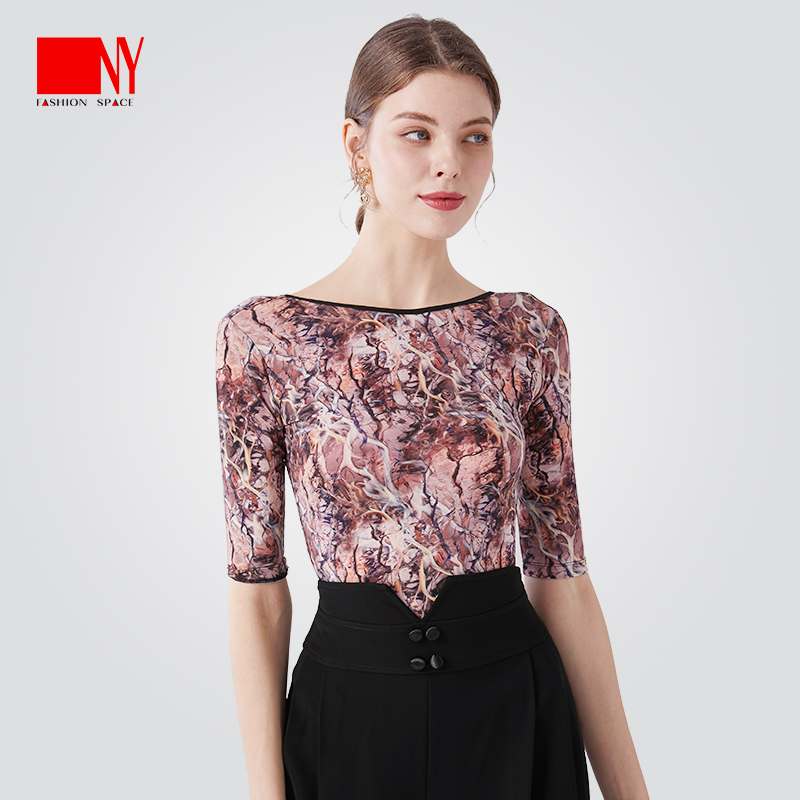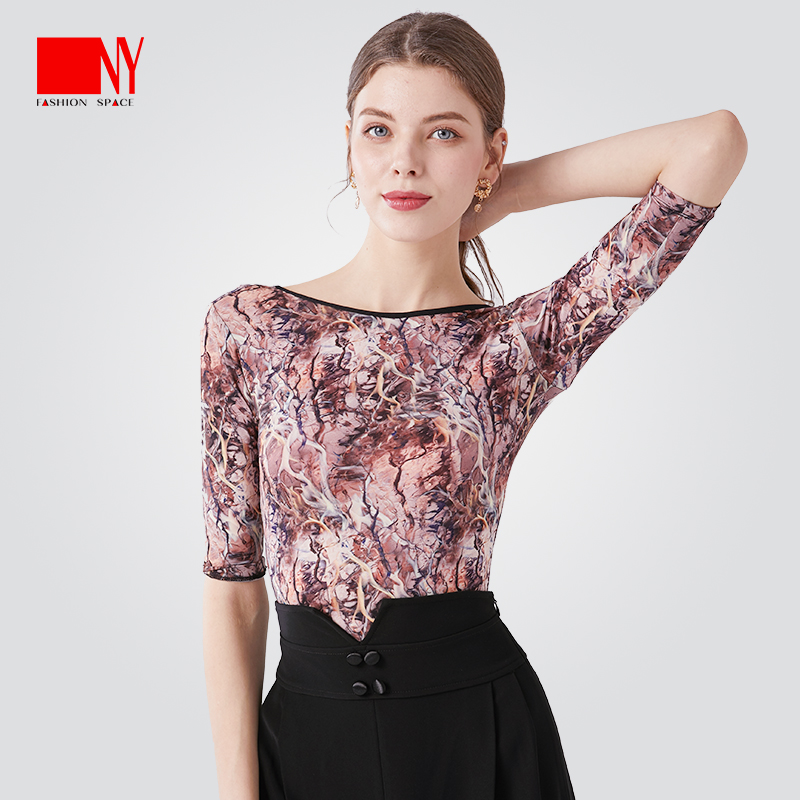 Nart Morden dance dress print Livewear woman Fashion sashimi round collar social dance clothes blouses 50% sleeves