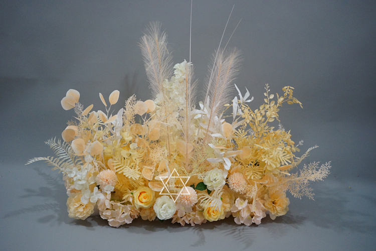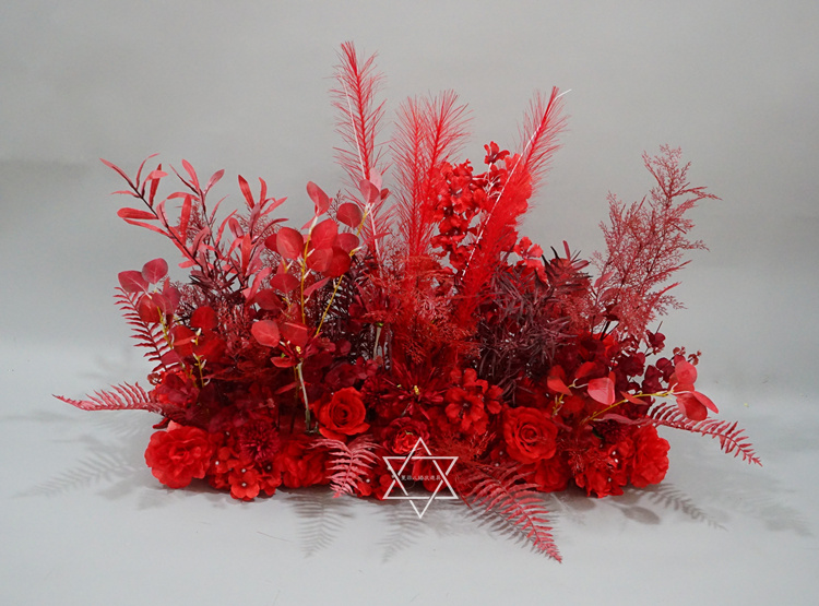 Long row of red reeds, blue reeds, long row of pink reeds, long row of champagne reeds, long row of red reeds, champagne-colored reeds, blue reeds, white reeds