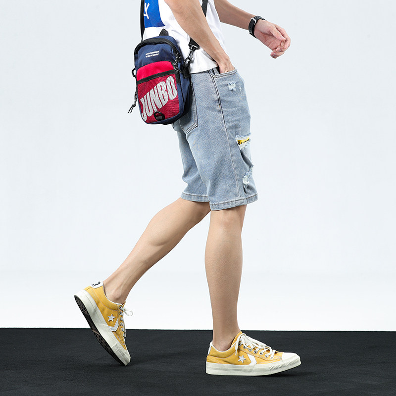 Light-coloured water-washed Hole Cowboy Shorts Male 50% Pants Elastic workout printed 50% Pants Tide Card Spirit Little Guy Pants